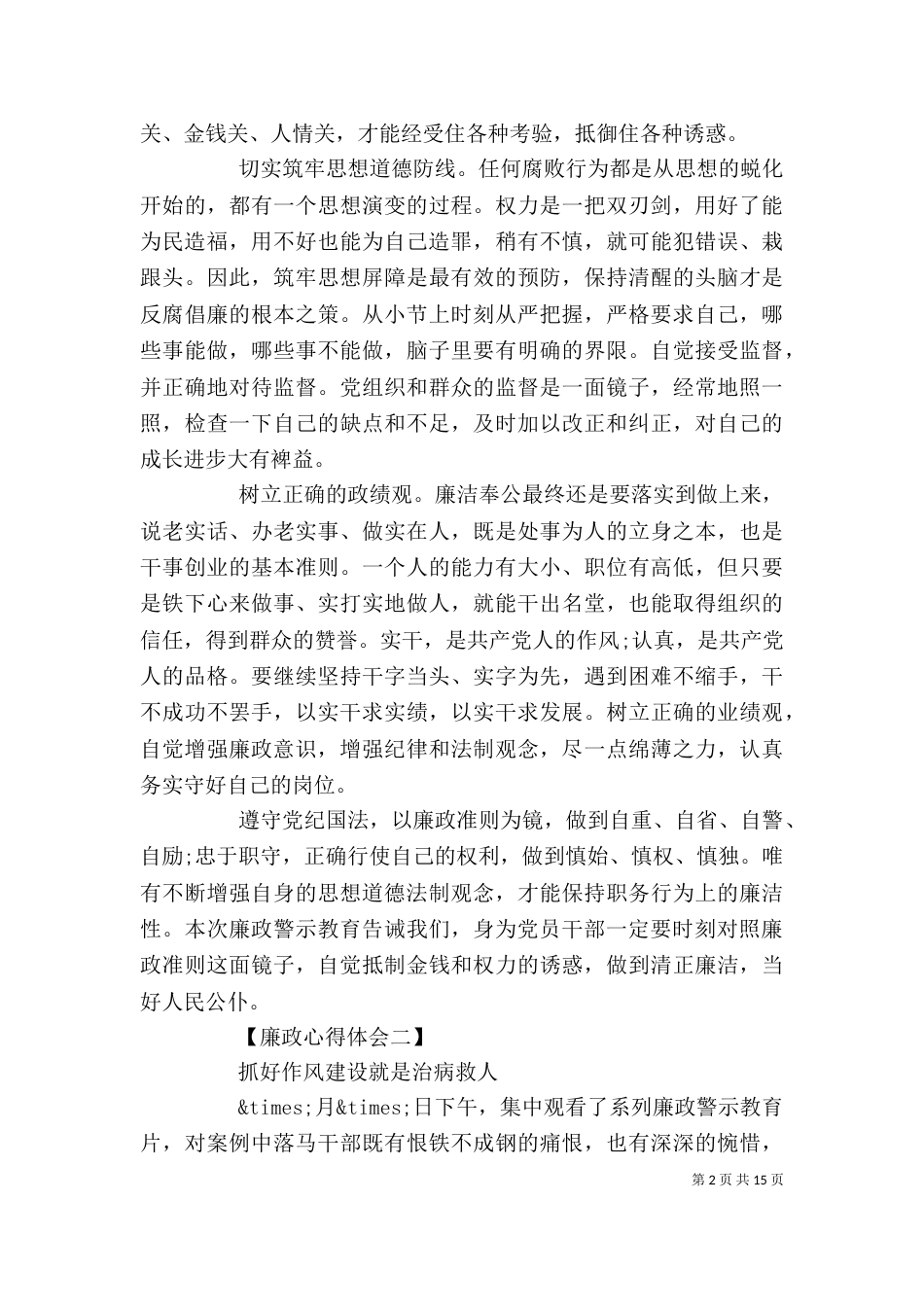 第1页共15页廉政警示教育心得体会汇编筑牢思想防线严守纪法底线×月×日下午,我单位组织党员干部赴市廉政教育馆接受廉政警示教...