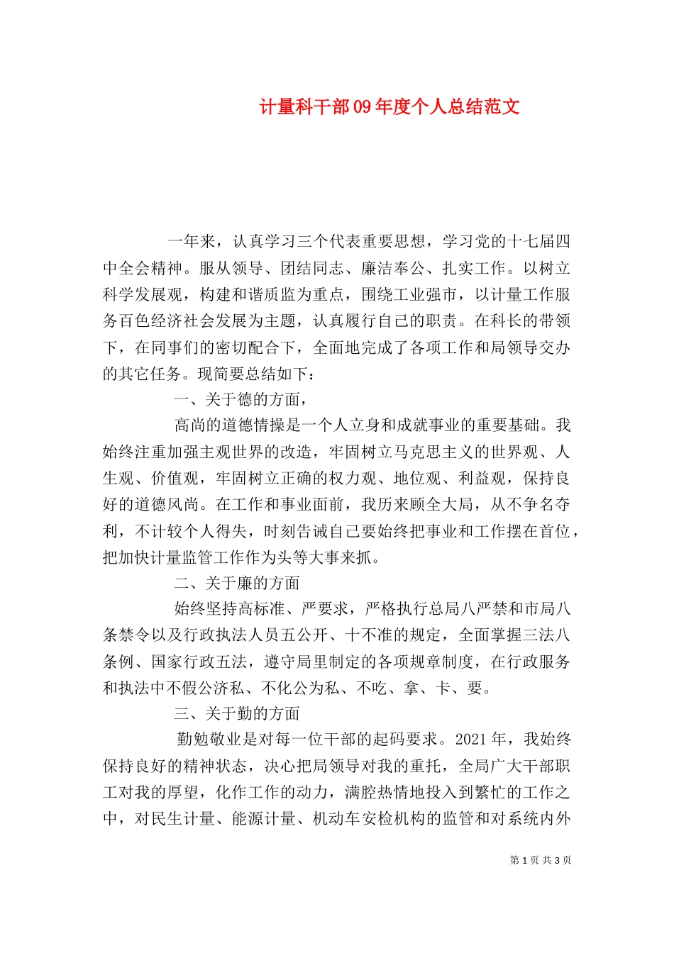 第1页共3页计量科干部09年度个人总结范文一年来,认真学习三个代表重要思想,学习党的十七届四中全会精神。服从领导、团结同志、廉洁奉公、...