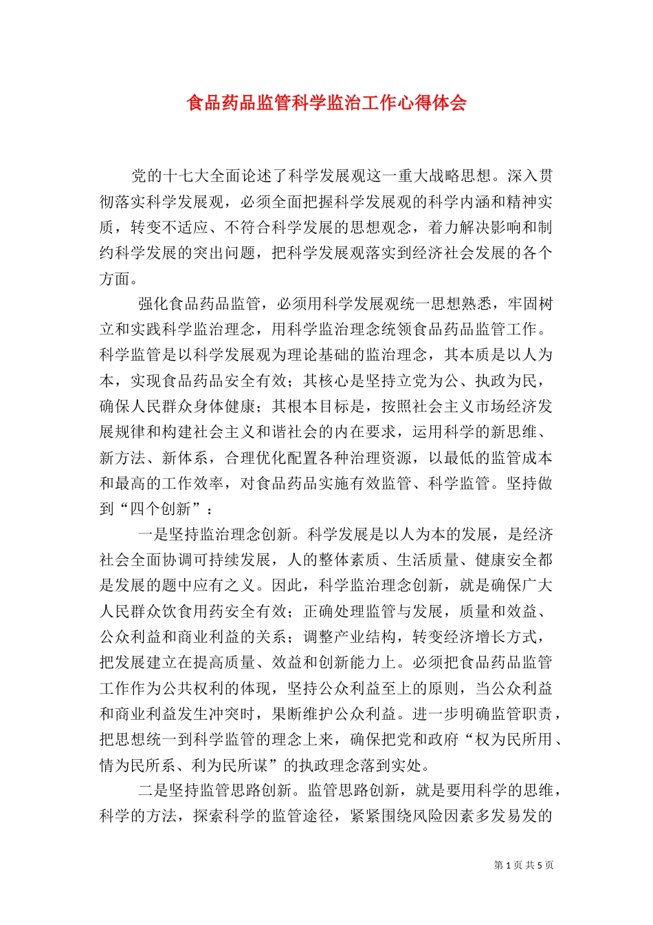 第1页共5页书山有路勤为径,学海无涯苦作舟。食品药品监管科学监治工作心得体会党的十七大全面论述了科学发展观这一重大战略思想。深入贯彻...