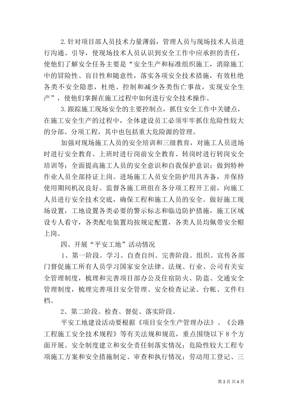 第1页共6页书山有路勤为径,学海无涯苦作舟。公路工程项目平安工地总结xx至xx二级公路工程“平安工地”活动总结合同段:xxx施工单位:xxx监...