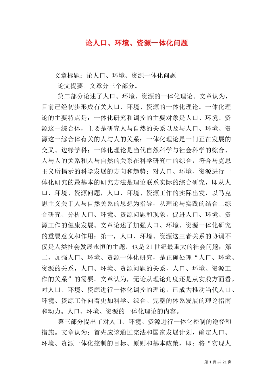 第1页共21页论人口、环境、资源一体化问题文章标题:论人口、环境、资源一体化问题论文提要。文章分三个部分。第二部分论述了人口、环境、...