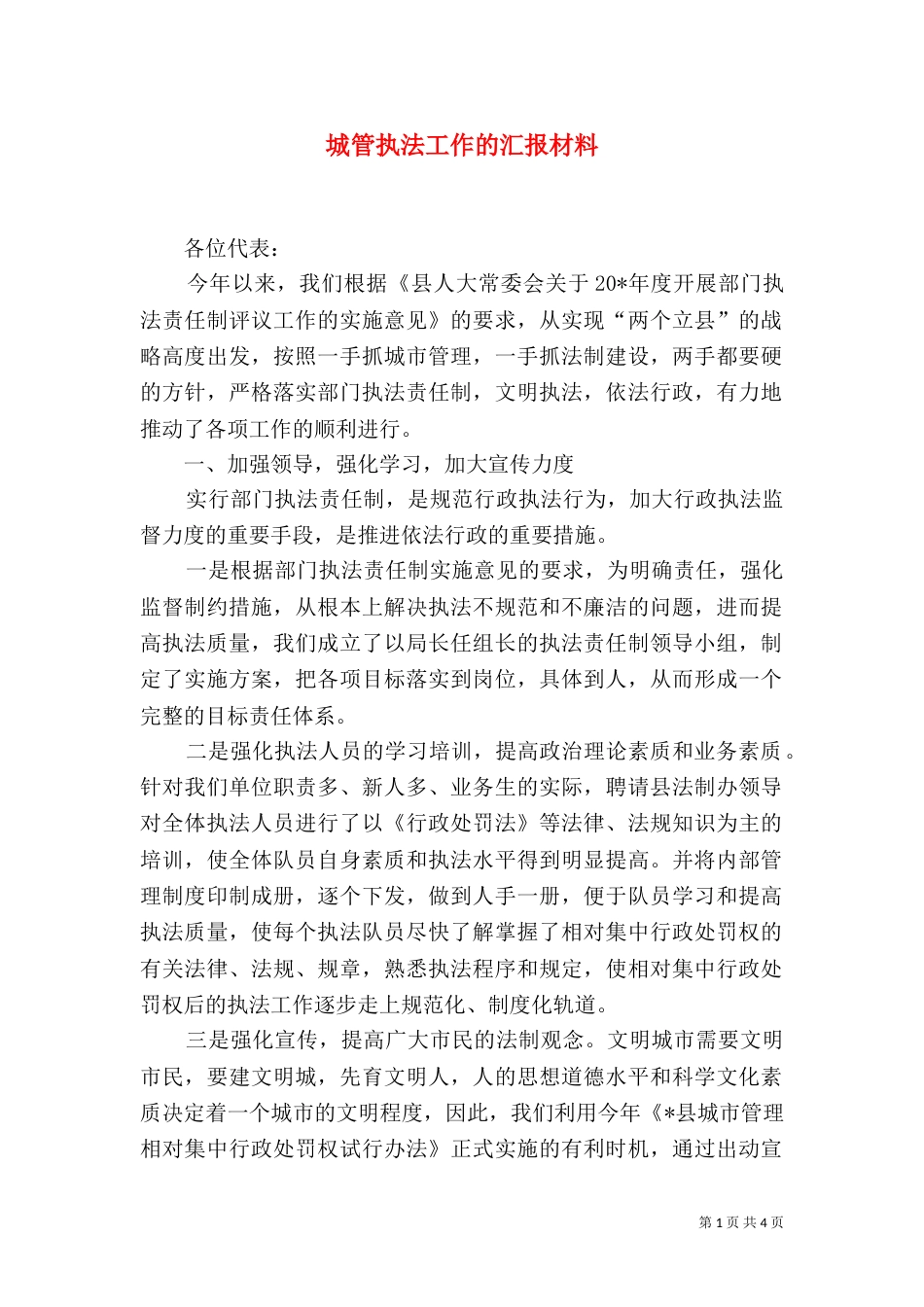 第1页共4页书山有路勤为径,学海无涯苦作舟。城管执法工作的汇报材料各位代表:今年以来,我们根据《县人大常委会关于20*年度开展部门执法...