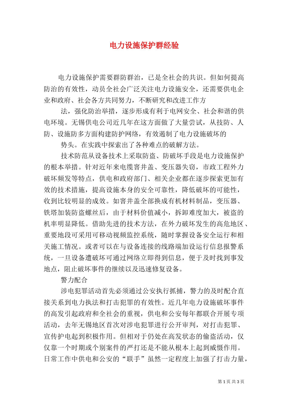 第1页共3页书山有路勤为径,学海无涯苦作舟。电力设施保护群经验电力设施保护需要群防群治,已是全社会的共识。但如何提高防治的有效性,动...