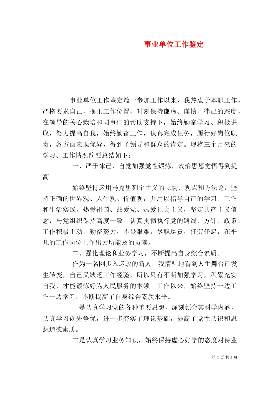 第1页共5页事业单位工作鉴定事业单位工作鉴定篇一参加工作以来,我热衷于本职工作,严格要求自己,摆正工作位置,时刻保持谦虚、谨慎、律己...