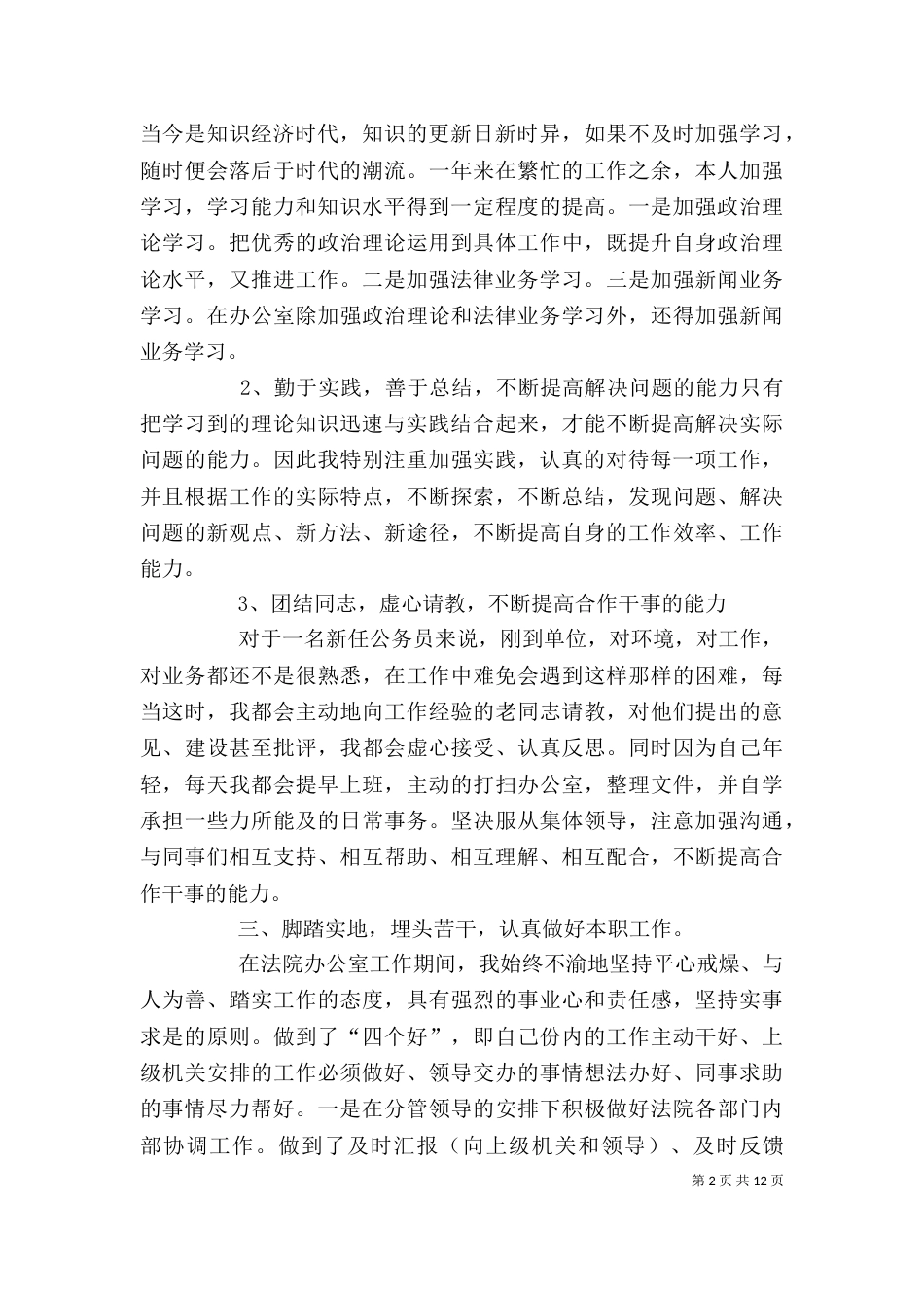第1页共12页新入职公务员一年的工作总结转眼到法院工作已满一年,这一年时间,在单位领导、同事们的关心帮助下,我努力做到爱岗敬业,恪尽...