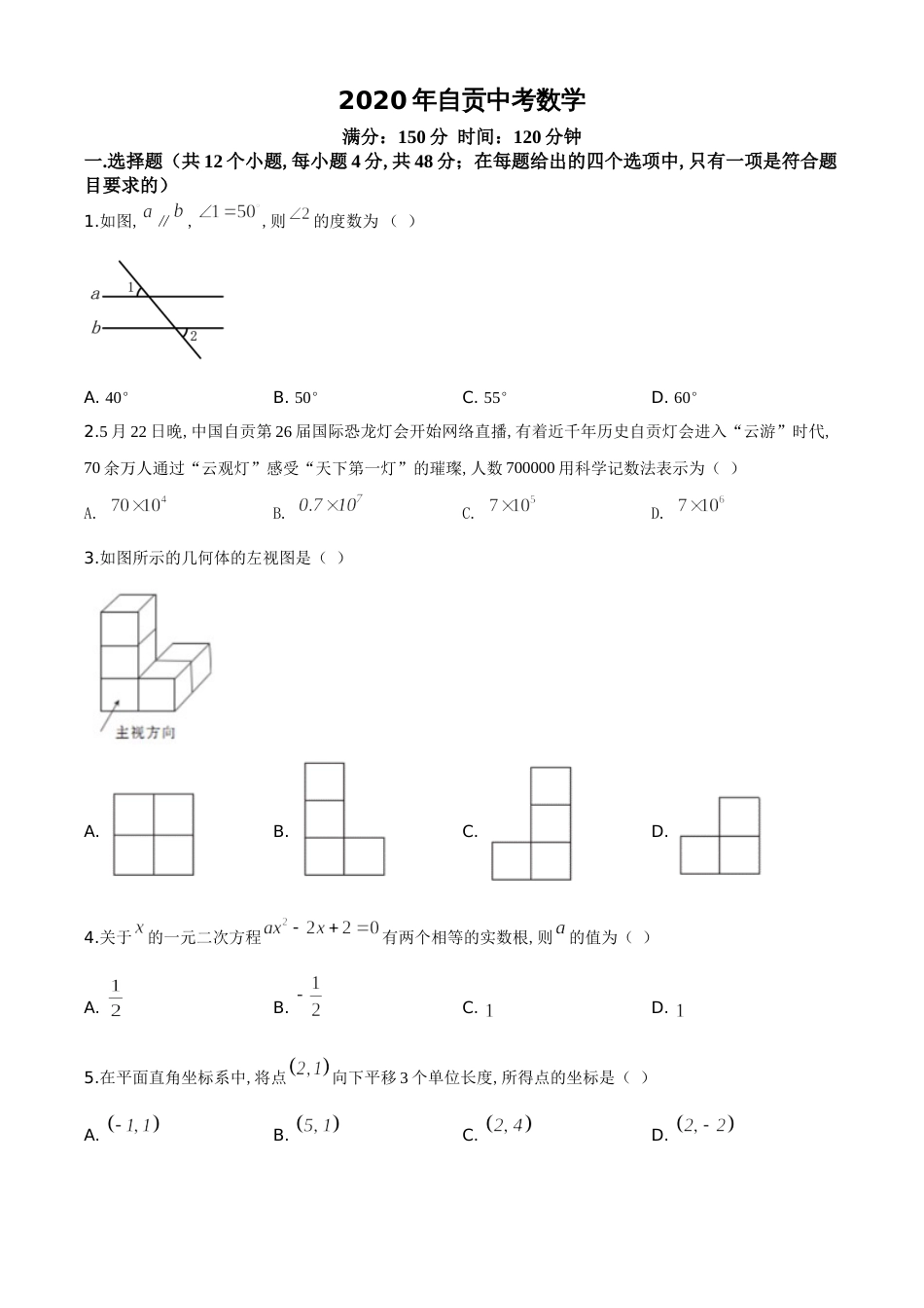精品解析:四川省自贡市2020年中考数学试题(原卷版)_第1页