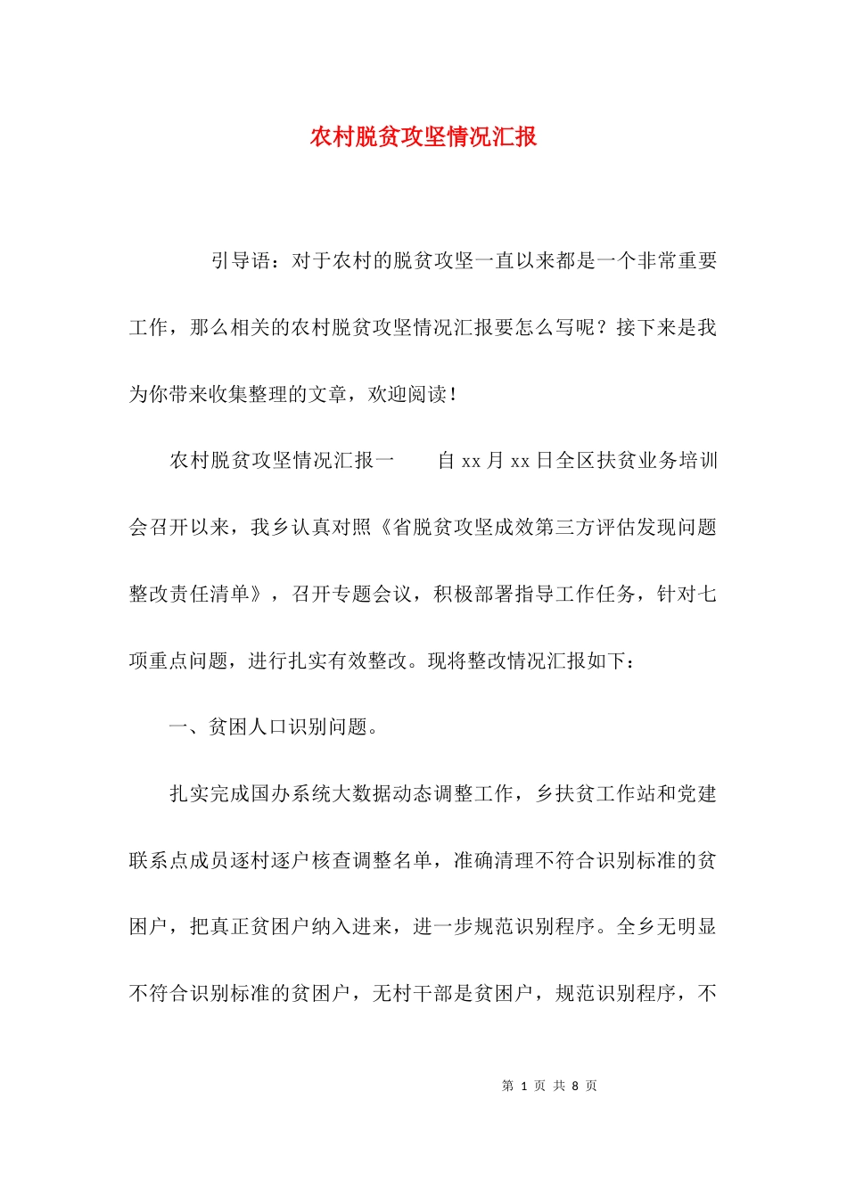 第1页共8页农村脱贫攻坚情况汇报引导语:对于农村的脱贫攻坚一直以来都是一个非常重要工作,那么相关的农村脱贫攻坚情况汇报要怎么写呢?接...