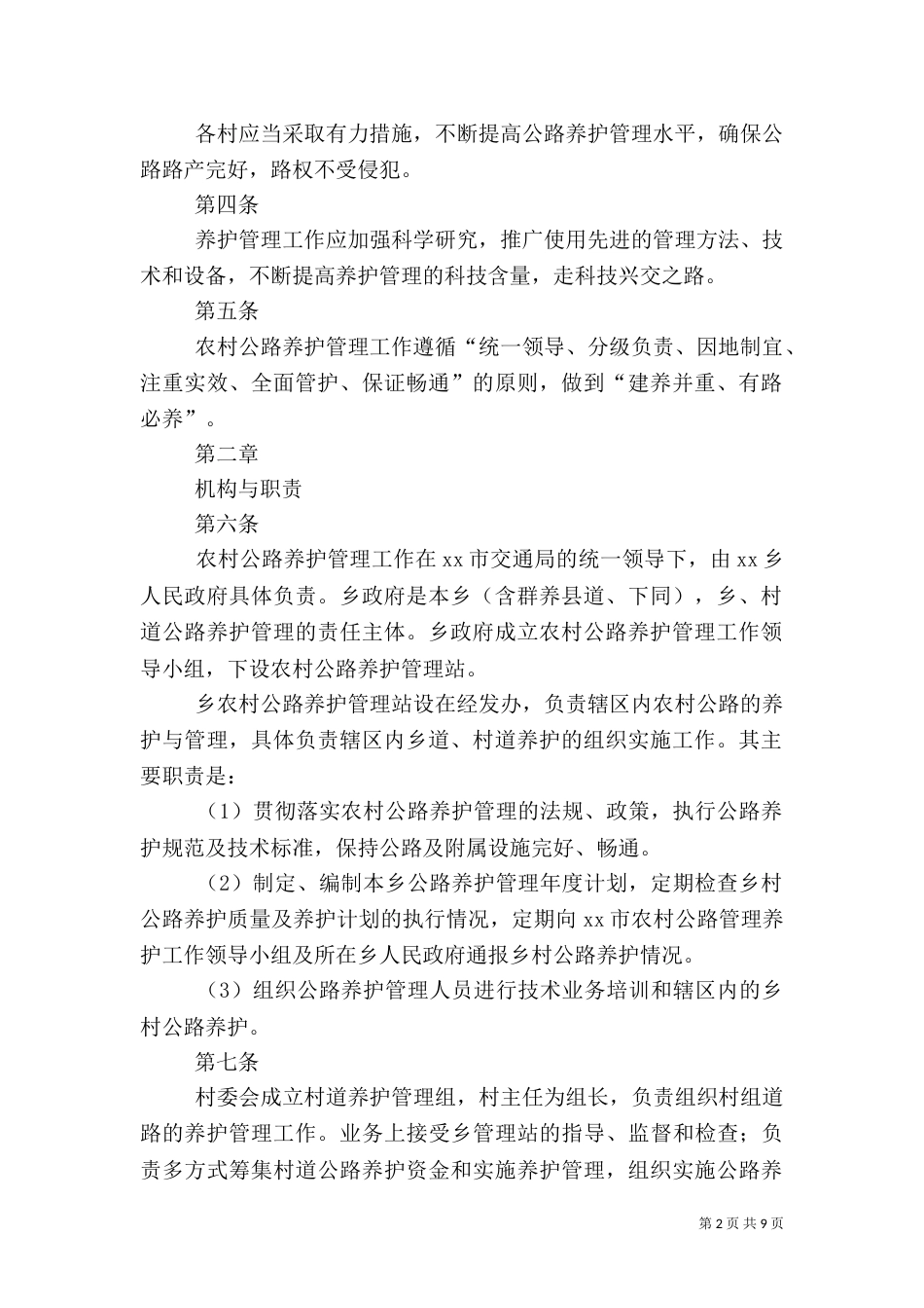 第1页共9页书山有路勤为径,学海无涯苦作舟。农村公路建设管理制度xx乡农村公路养护管理制度第一章总则第一条为加强我乡农村公路养护管理,...