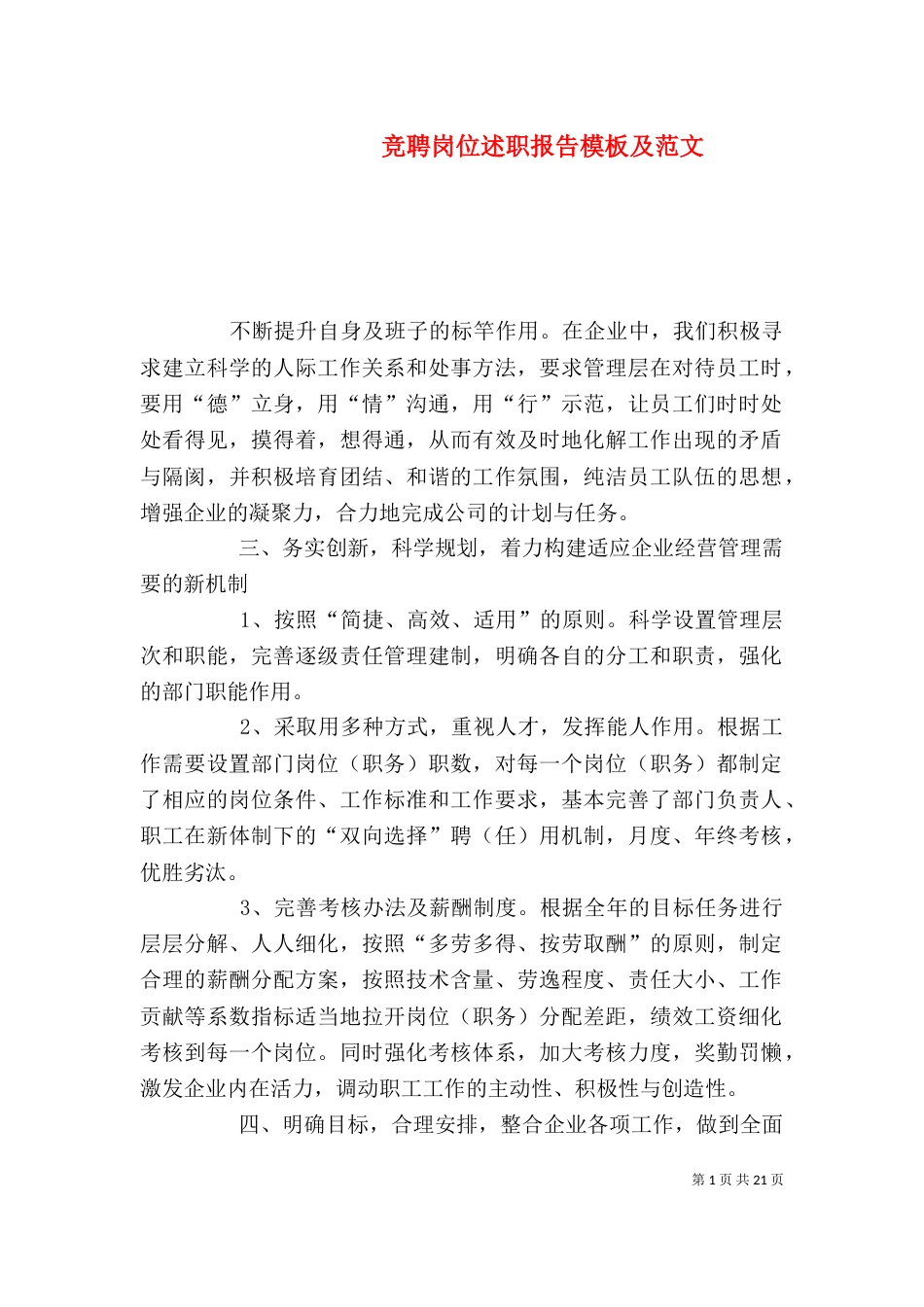 第1页共21页竞聘岗位述职报告模板及范文不断提升自身及班子的标竿作用。在企业中,我们积极寻求建立科学的人际工作关系和处事方法,要求管...