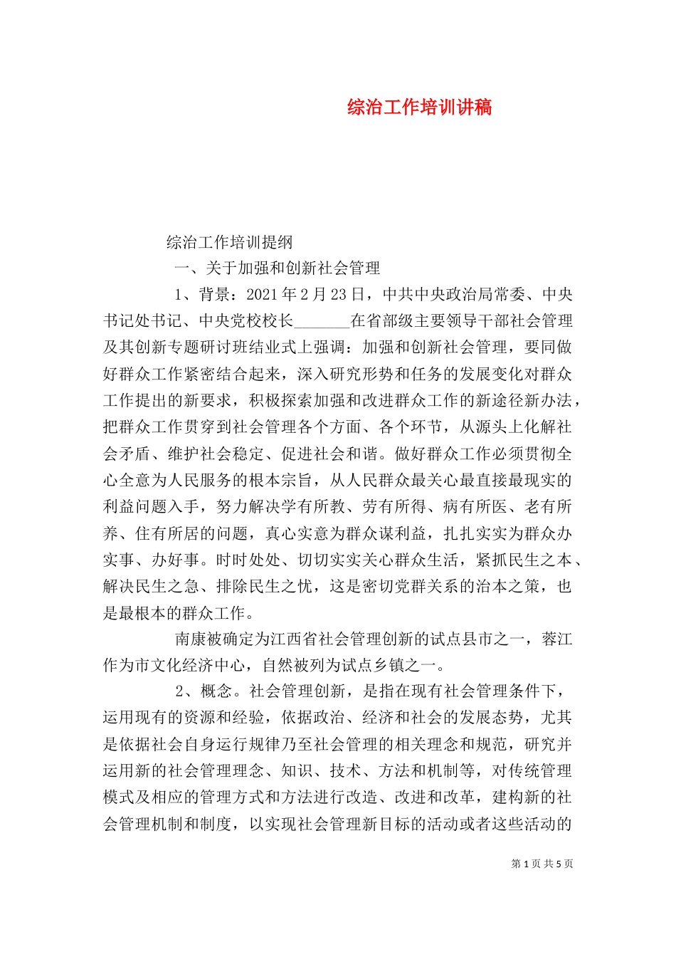 第1页共5页综治工作培训讲稿综治工作培训提纲一、关于加强和创新社会管理1、背景:2021年2月23日,中共中央政治局常委、中央书记处书记、中...