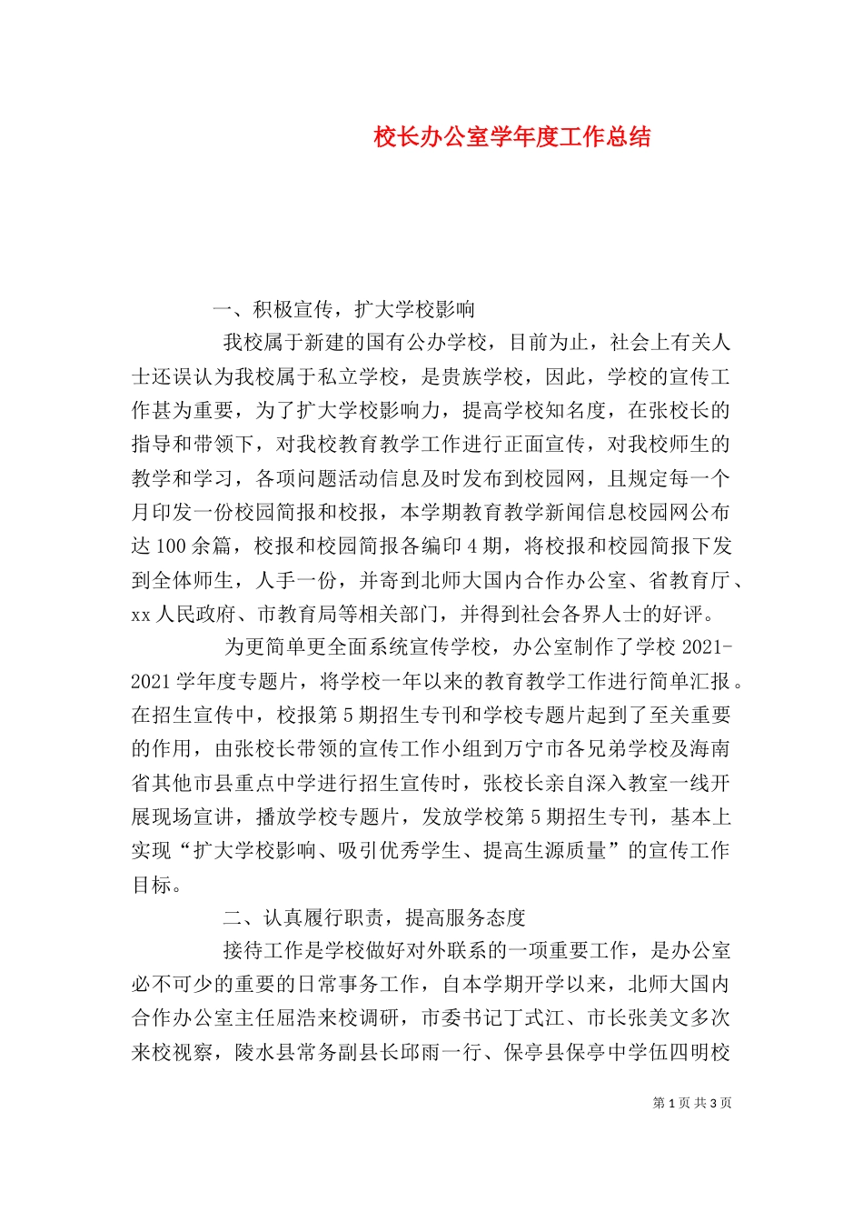第1页共3页校长办公室学年度工作总结一、积极宣传,扩大学校影响我校属于新建的国有公办学校,目前为止,社会上有关人士还误认为我校属于私...