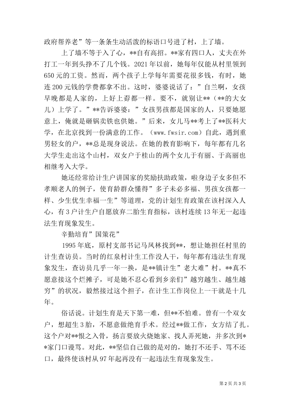 第1页共3页书山有路勤为径,学海无涯苦作舟。村计生主任先进事迹材料兰开自芬芳--记**县**镇红泉村计生主任先进事迹材料在山东省**县**街道...