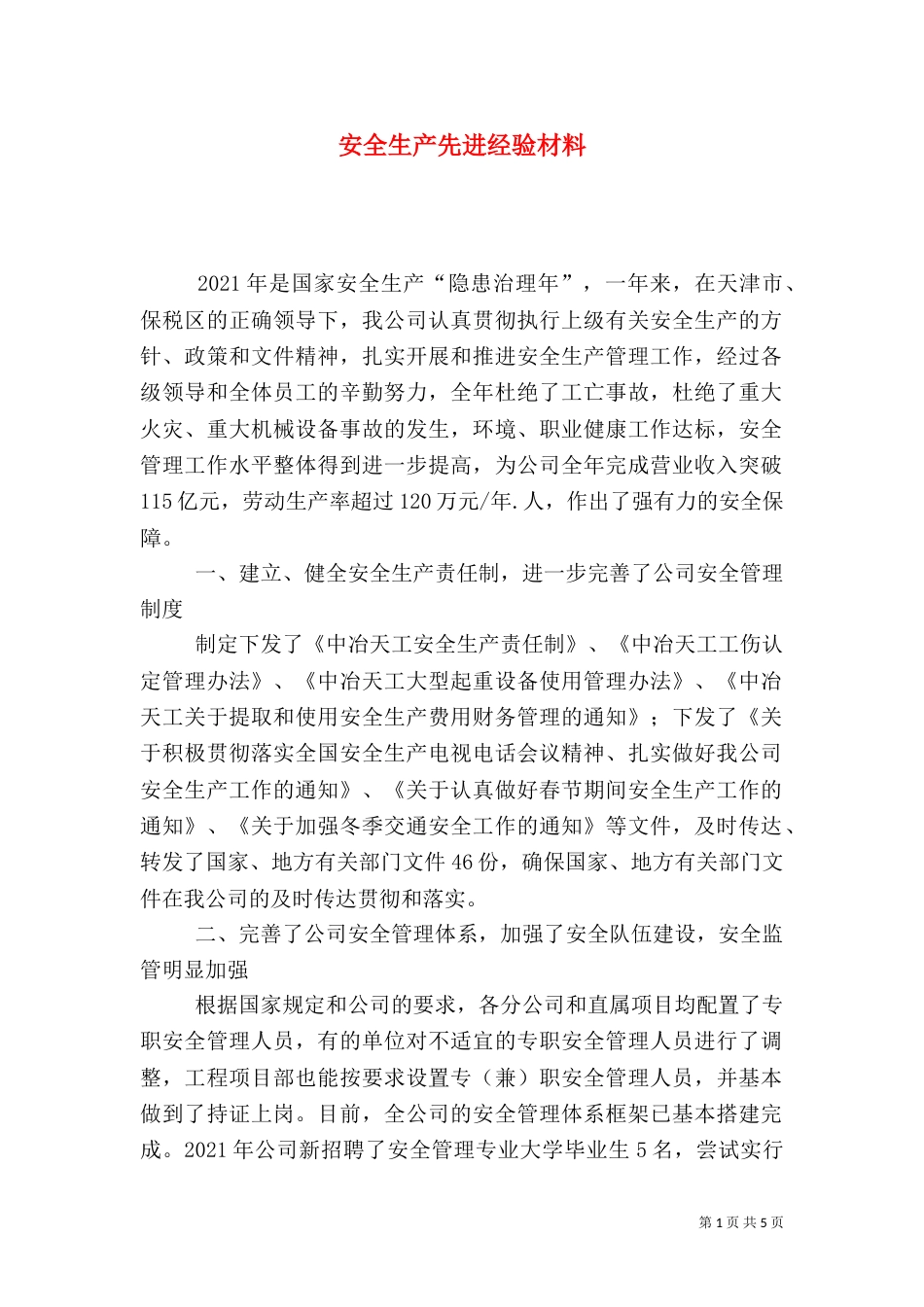 第1页共5页书山有路勤为径,学海无涯苦作舟。安全生产先进经验材料2021年是国家安全生产“隐患治理年”,一年来,在天津市、保税区的正确领...