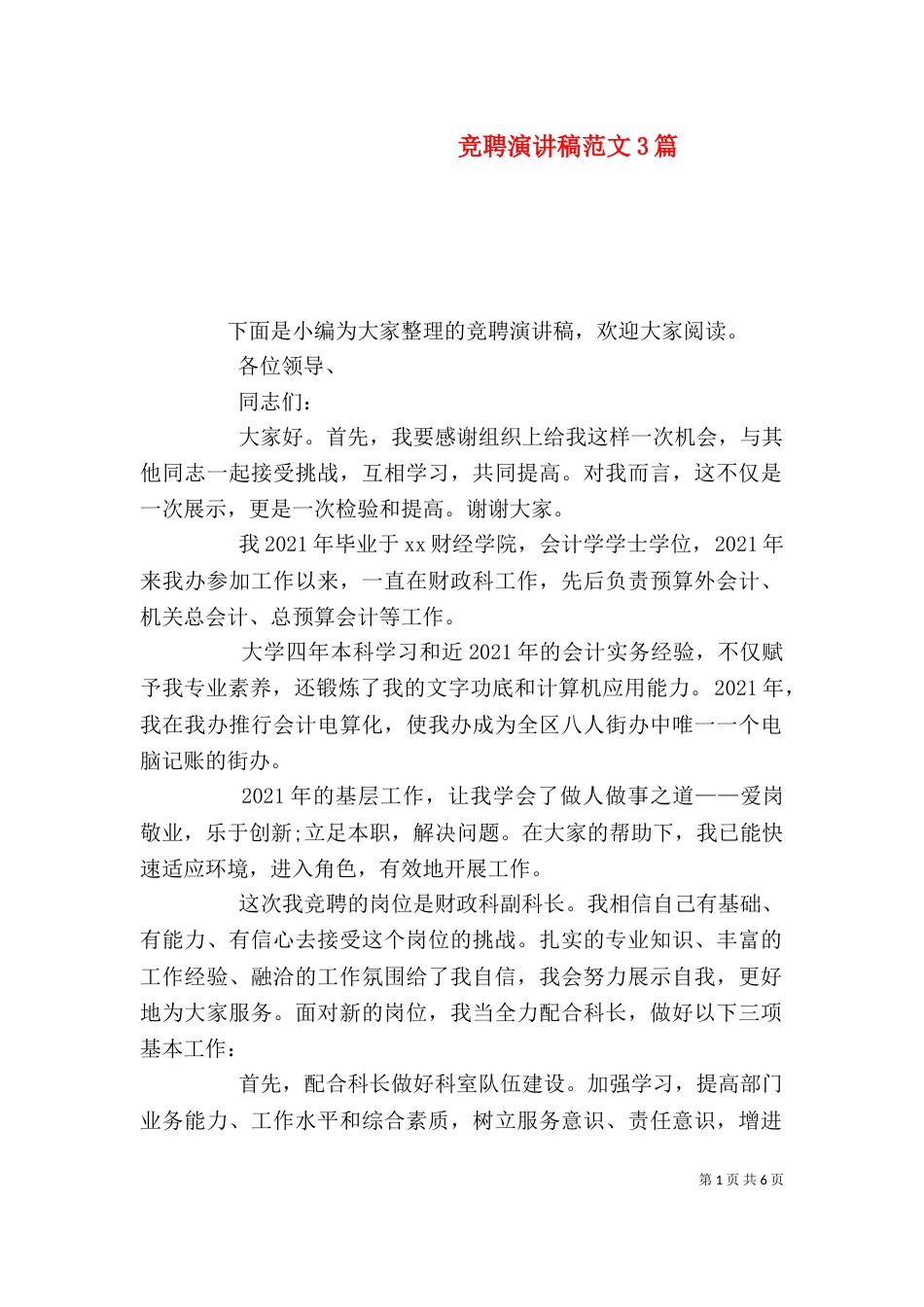 第1页共6页竞聘演讲稿范文3篇下面是小编为大家整理的竞聘演讲稿,欢迎大家阅读。各位领导、同志们:大家好。首先,我要感谢组织上给我这样...