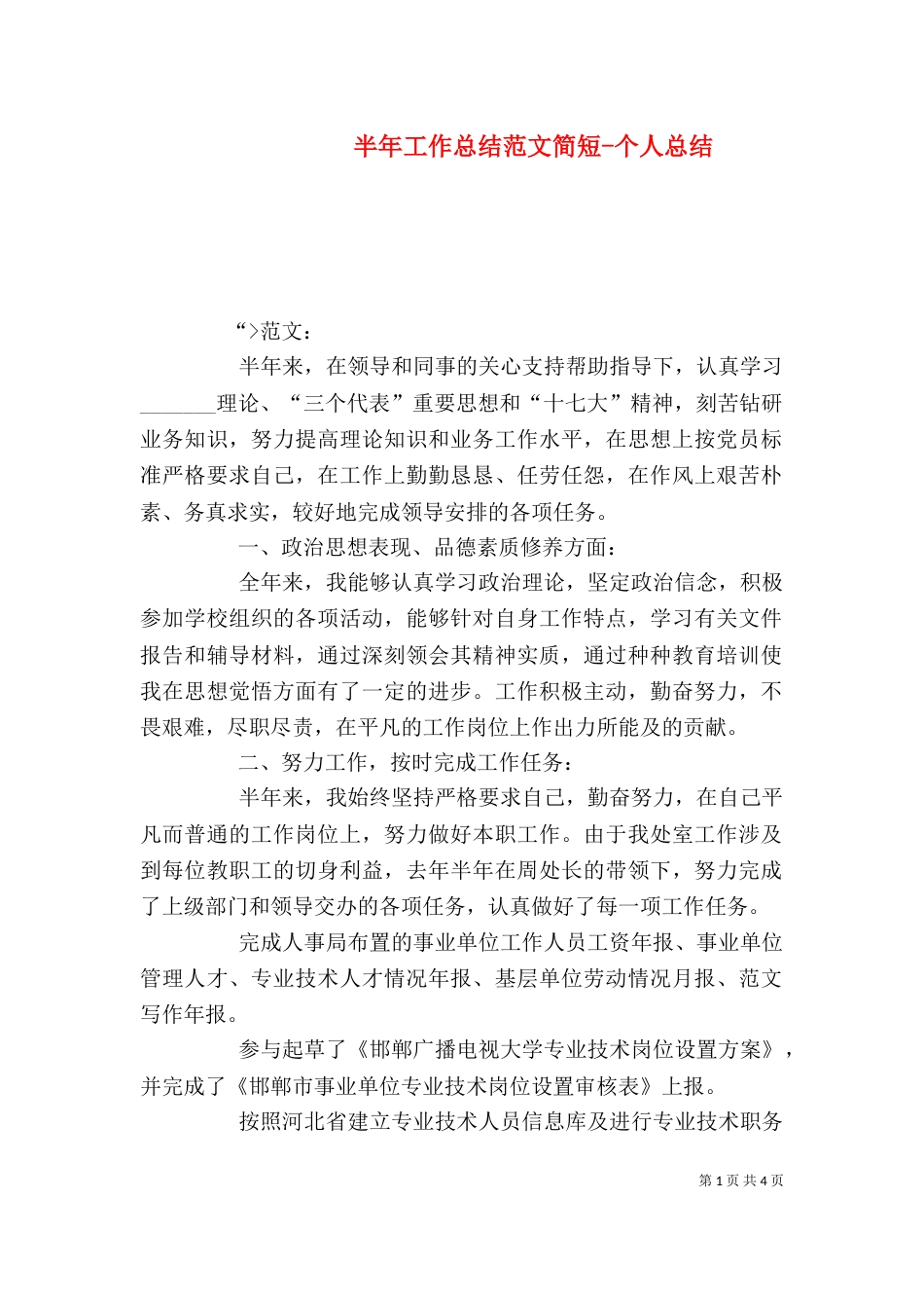 第1页共4页半年工作总结范文简短-个人总结“>范文:半年来,在领导和同事的关心支持帮助指导下,认真学习_______理论、“三个代表”重要思...