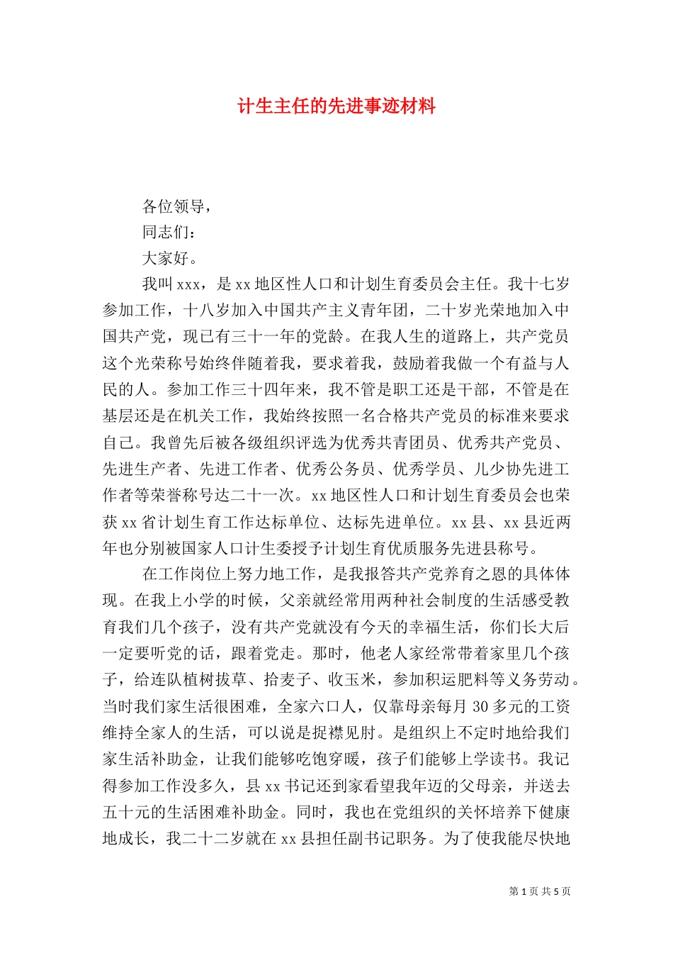 第1页共5页书山有路勤为径,学海无涯苦作舟。计生主任的先进事迹材料各位领导,同志们:大家好。我叫xxx,是xx地区性人口和计划生育委员会...