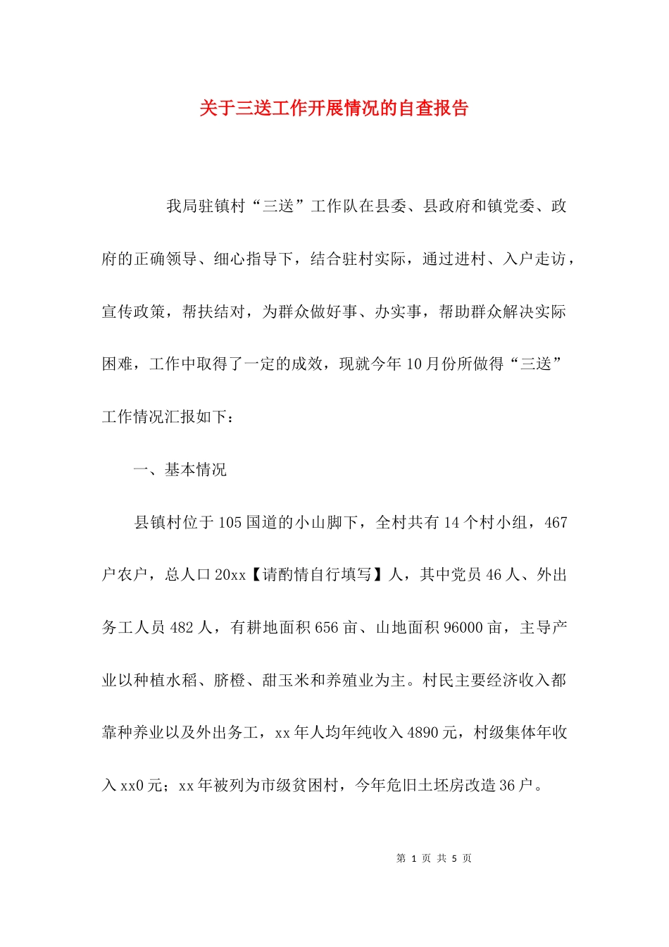 第1页共5页关于三送工作开展情况的自查报告我局驻镇村“三送”工作队在县委、县政府和镇党委、政府的正确领导、细心指导下,结合驻村实际,...