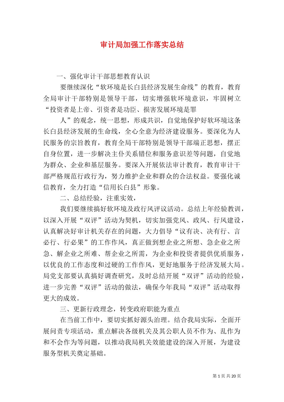 第1页共20页书山有路勤为径,学海无涯苦作舟。审计局加强工作落实总结一、强化审计干部思想教育认识要继续深化“软环境是长白县经济发展生...