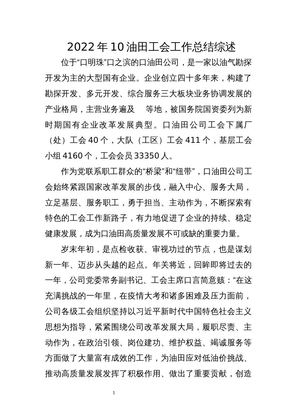 12022年10油田工会工作总结综述位于“口明珠”口之滨的口油田公司,是一家以油气勘探开发为主的大型国有企业。企业创立四十多年来,构建了...