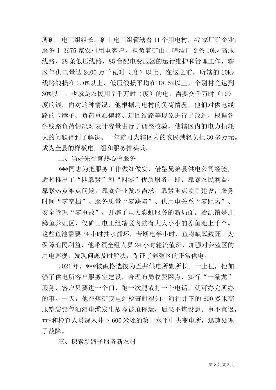 第1页共3页书山有路勤为径,学海无涯苦作舟。供电所职工先进材料编者按:本文主要从学好真本事惠及众乡亲;当好先行官热心搞服务;探索新路...