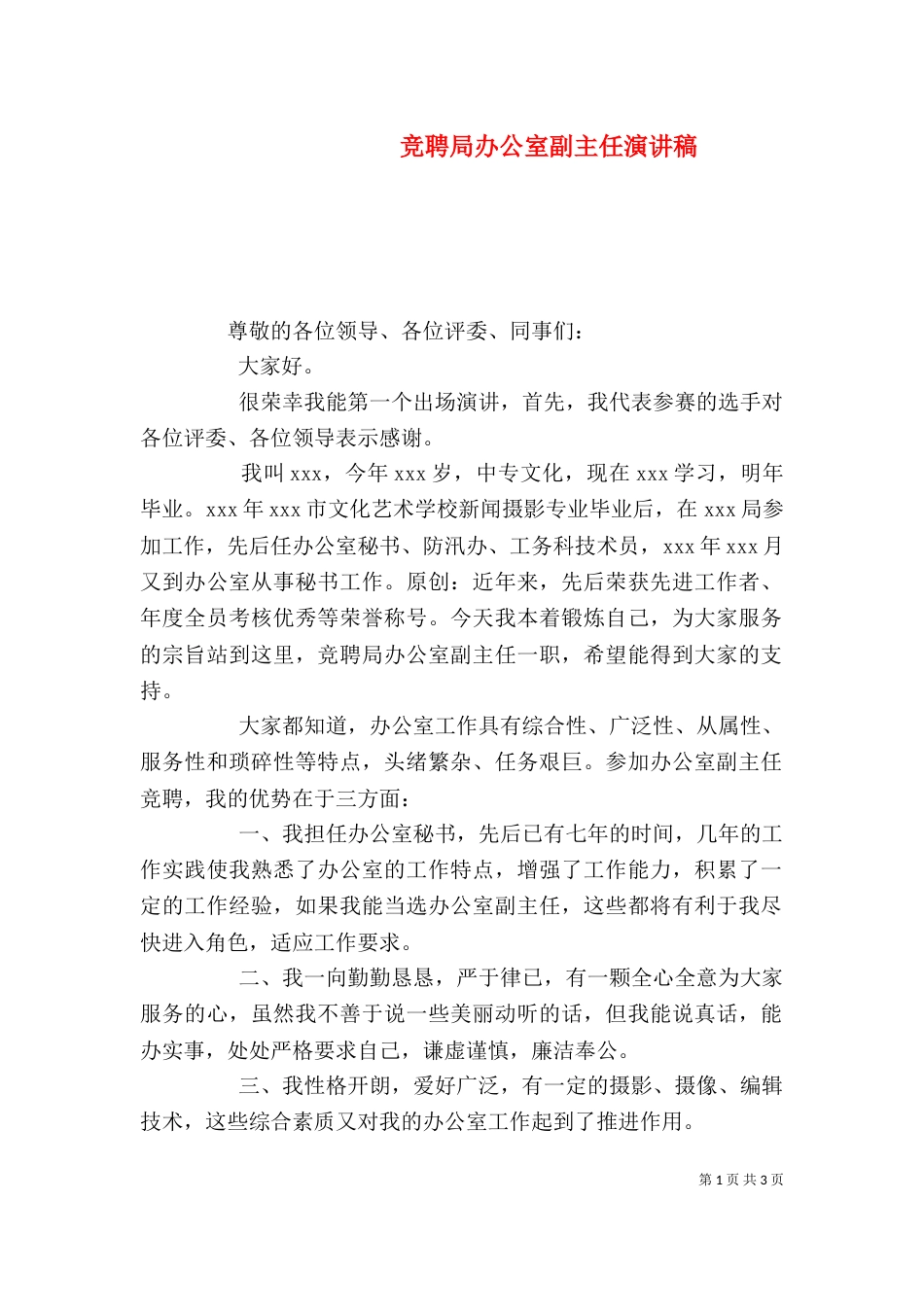 第1页共3页竞聘局办公室副主任演讲稿尊敬的各位领导、各位评委、同事们:大家好。很荣幸我能第一个出场演讲,首先,我代表参赛的选手对各位...