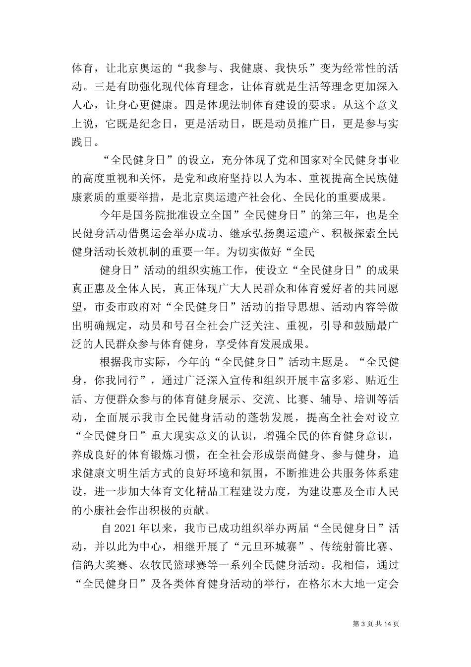 第1页共14页书山有路勤为径,学海无涯苦作舟。全民健身日讲话尊敬的各位领导、各位来宾,广大的市民朋友们:大家上午好。今天,我们在这里...