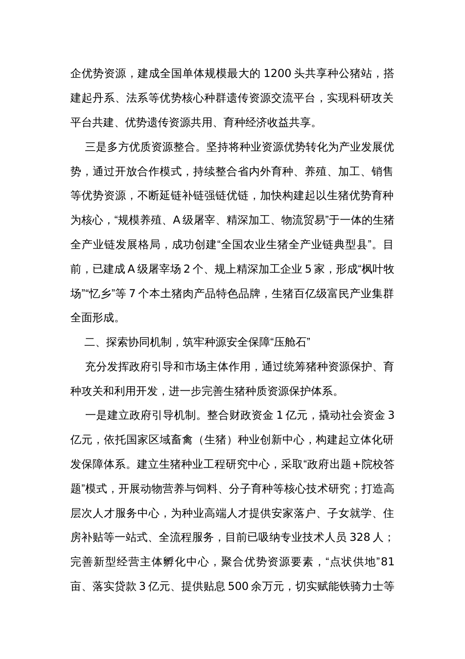 某县生猪产业高质量发展经验材料某县生猪产业高质量发展经验材料种业是现代农业发展的“芯片”。作为国家现代农业(生猪种业)产业园及国家...