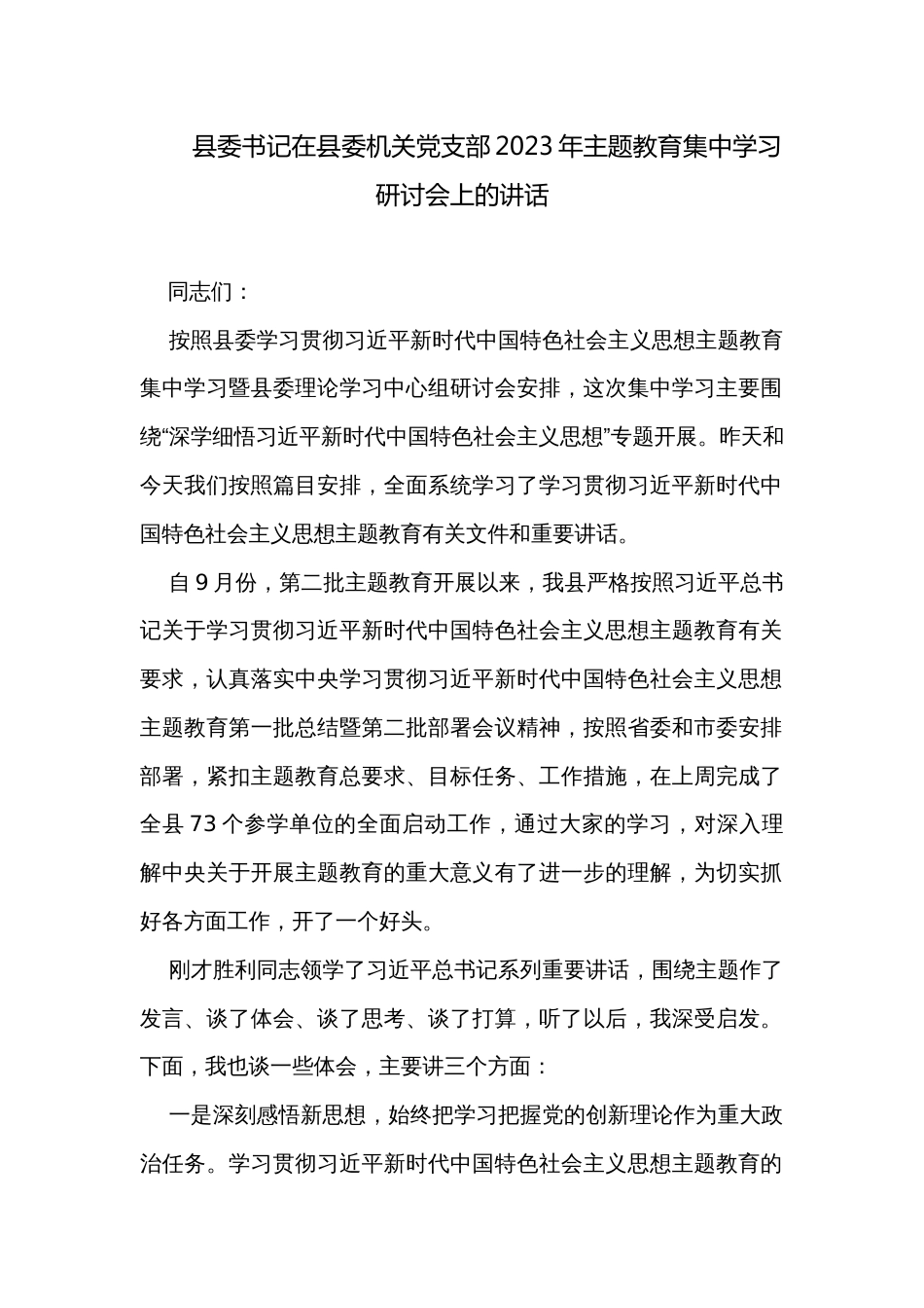 县委书记在县委机关党支部2023年主题教育集中学习研讨会上的讲话_第1页