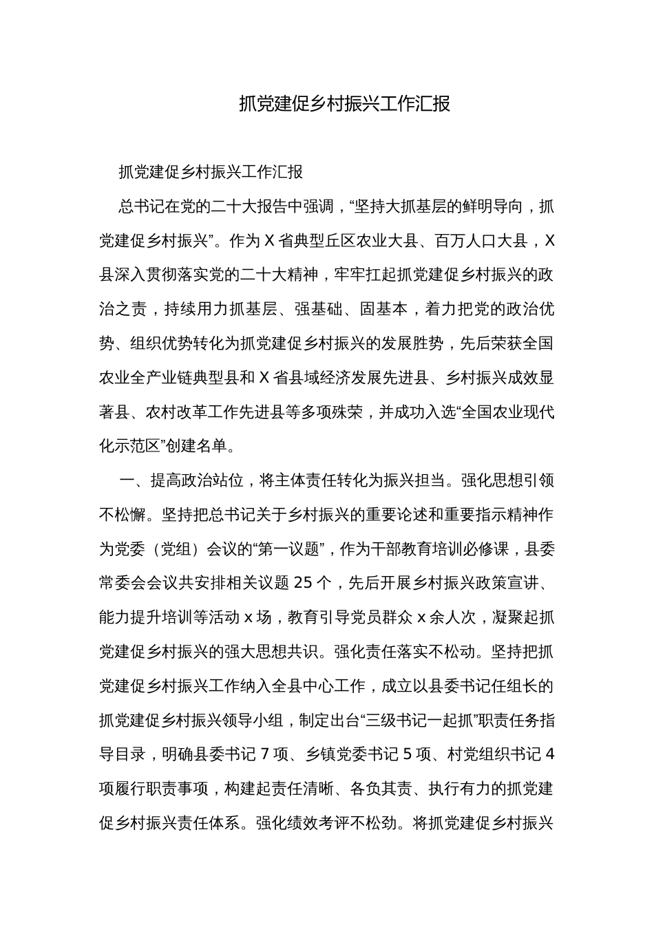 抓党建促乡村振兴工作汇报抓党建促乡村振兴工作汇报总书记在党的二十大报告中强调,“坚持大抓基层的鲜明导向,抓党建促乡村振兴”。作为X...