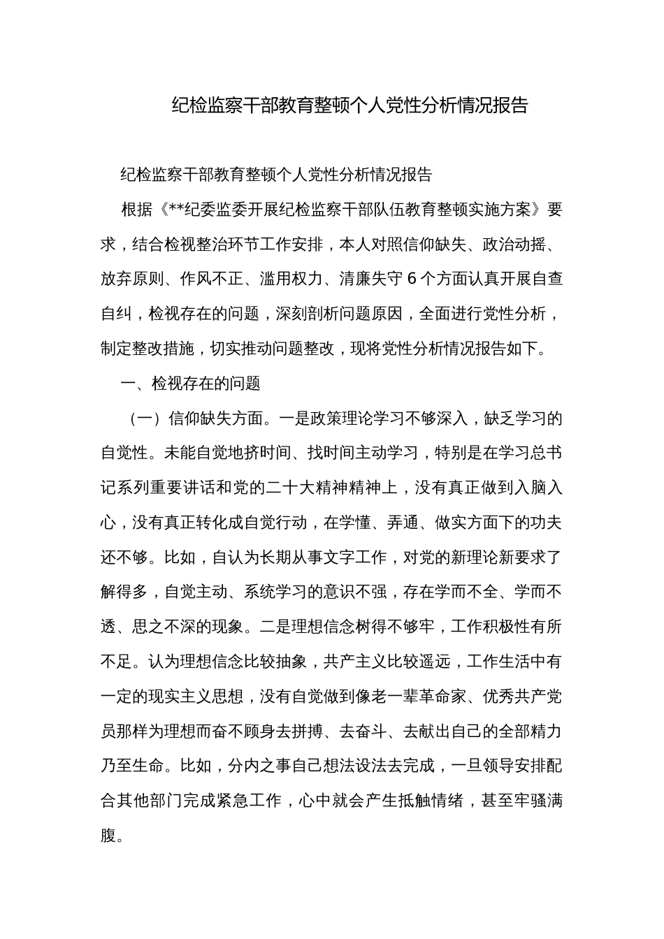 纪检监察干部教育整顿个人党性分析情况报告_第1页