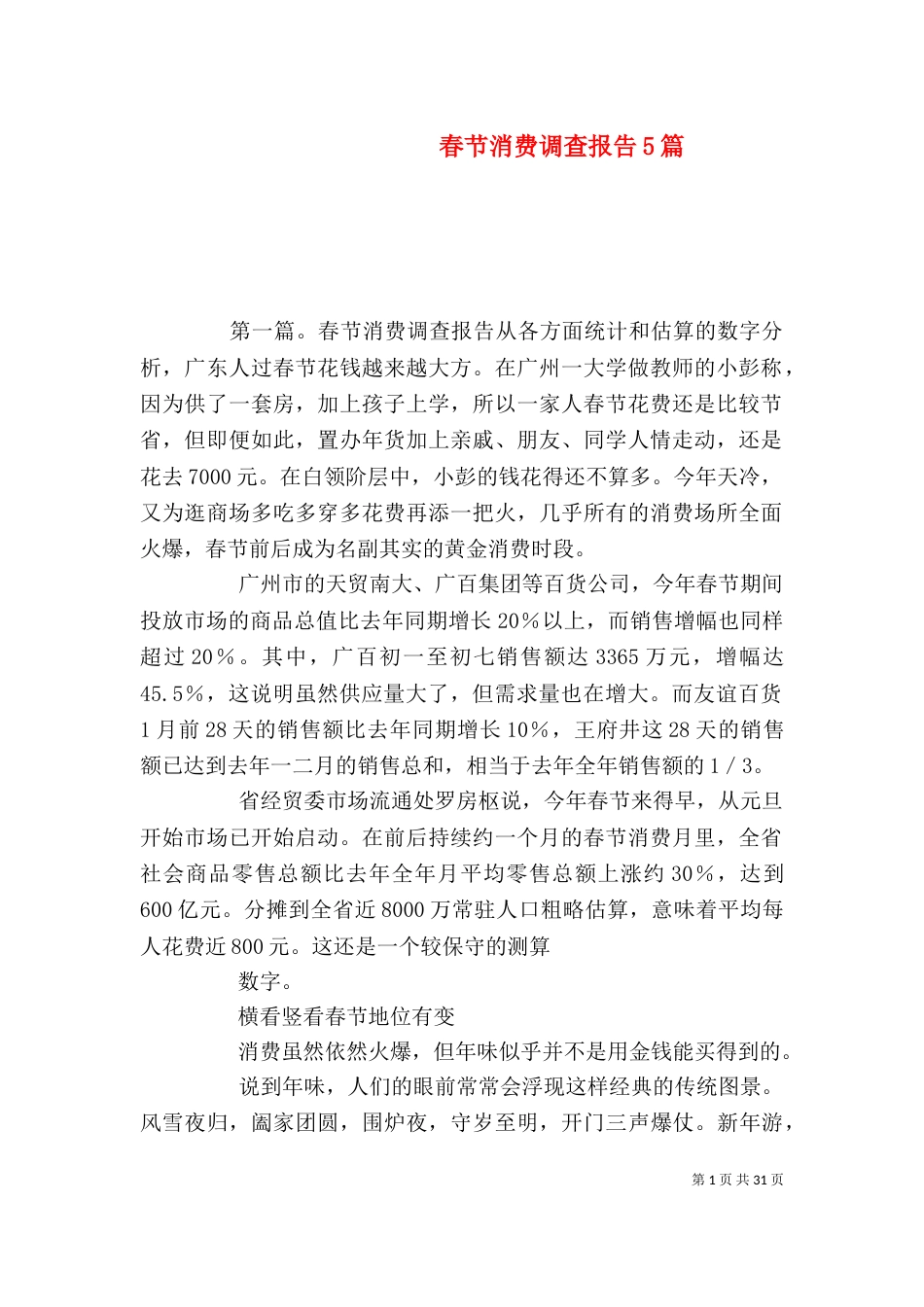 第1页共31页春节消费调查报告5篇第一篇。春节消费调查报告从各方面统计和估算的数字分析,广东人过春节花钱越来越大方。在广州一大学做教师...