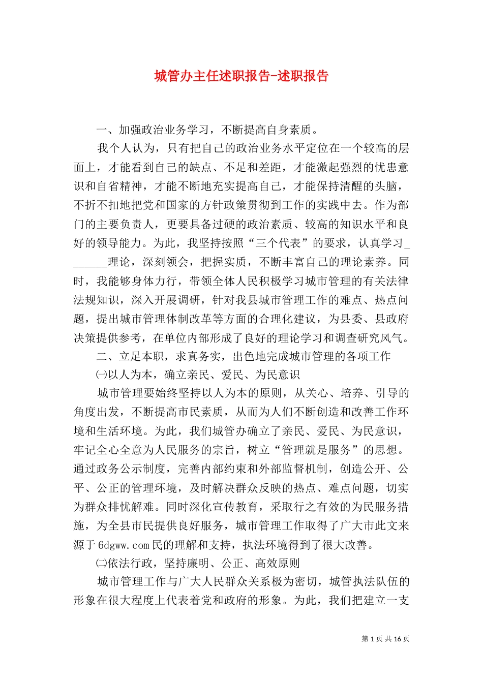 第1页共16页书山有路勤为径,学海无涯苦作舟。城管办主任述职报告-述职报告一、加强政治业务学习,不断提高自身素质。我个人认为,只有把自...