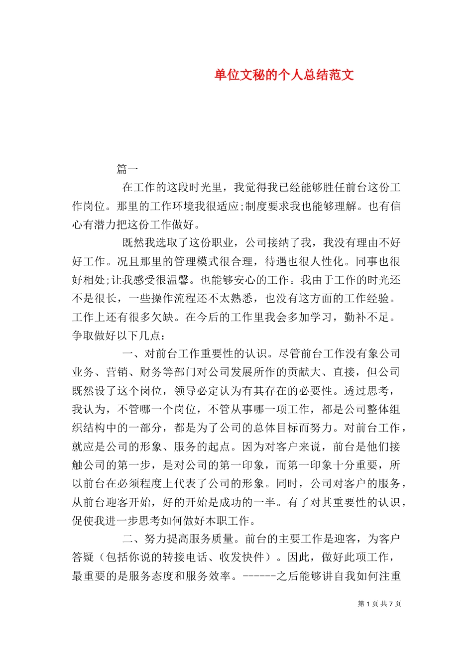 第1页共7页单位文秘的个人总结范文篇一在工作的这段时光里,我觉得我已经能够胜任前台这份工作岗位。那里的工作环境我很适应;制度要求我也...
