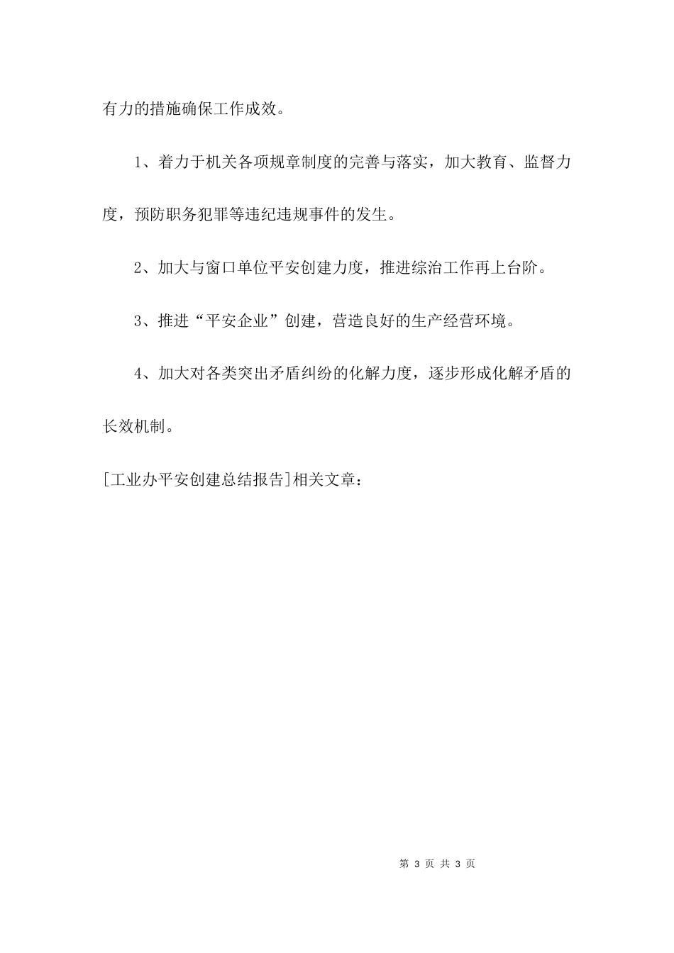 第1页共3页工业办平安创建总结报告一、推进机关日常综治体系建设。一方面,开展法制宣教,提升工作人员综治意识。工作中组织全体人员结合会...