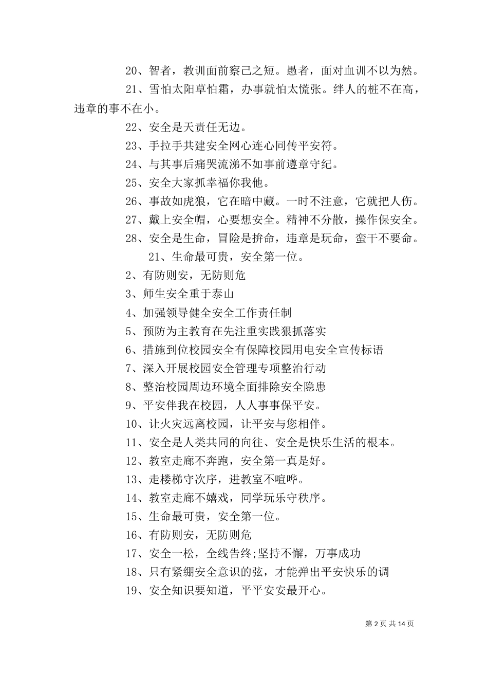第1页共14页用电安全的宣传标语11、多看一眼,安全保险;多防一步,少出事故;2、安全来于警惕,事故出于麻痹,一秒疏忽大意,今生追悔莫及。...