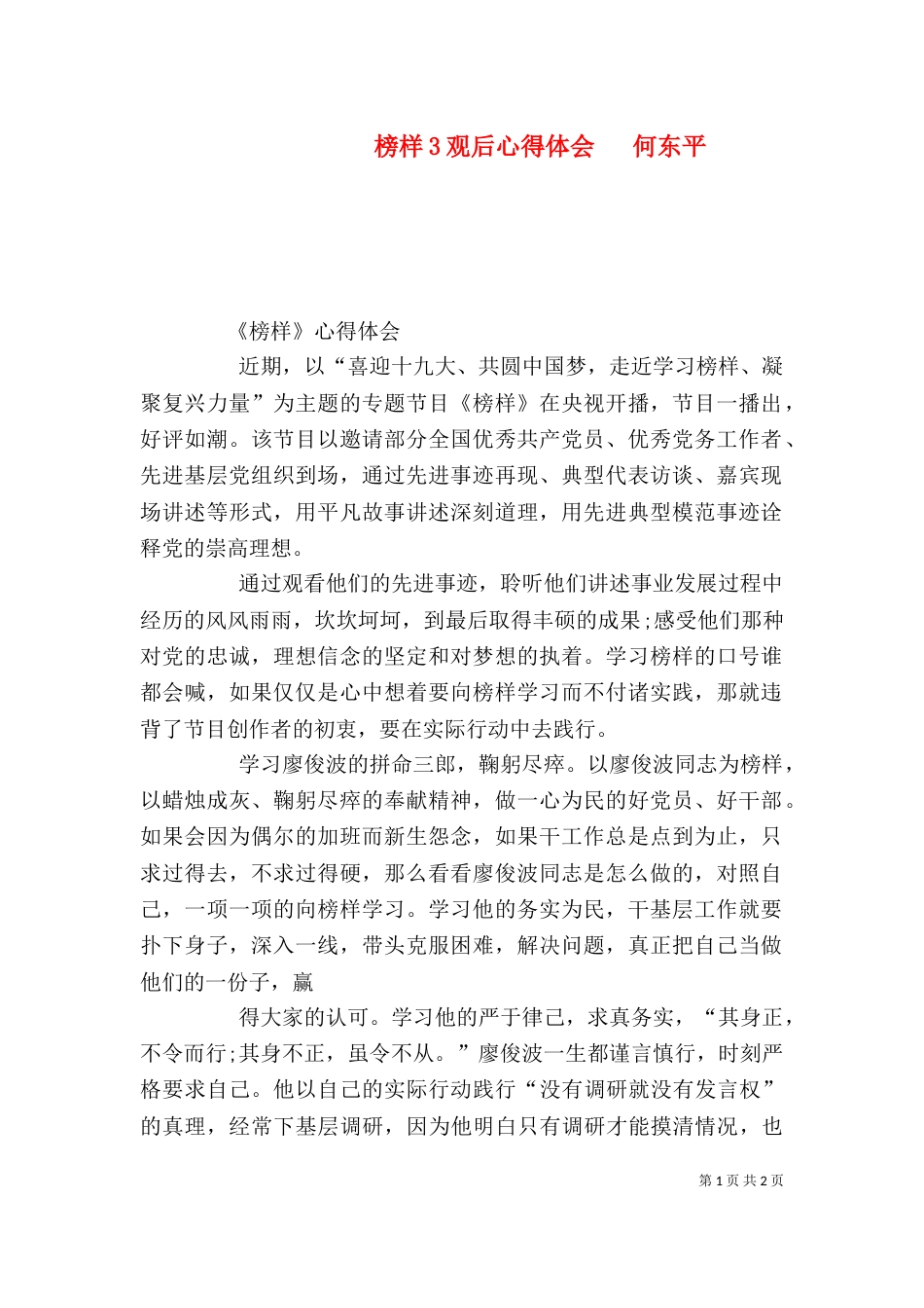 第1页共2页榜样3观后心得体会何东平《榜样》心得体会近期,以“喜迎十九大、共圆中国梦,走近学习榜样、凝聚复兴力量”为主题的专题节目《...