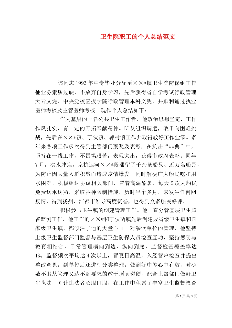 第1页共3页卫生院职工的个人总结范文该同志1993年中专毕业分配至××*镇卫生院防保组工作,他业务素质过硬,不放弃自身学习,先后获得省自...