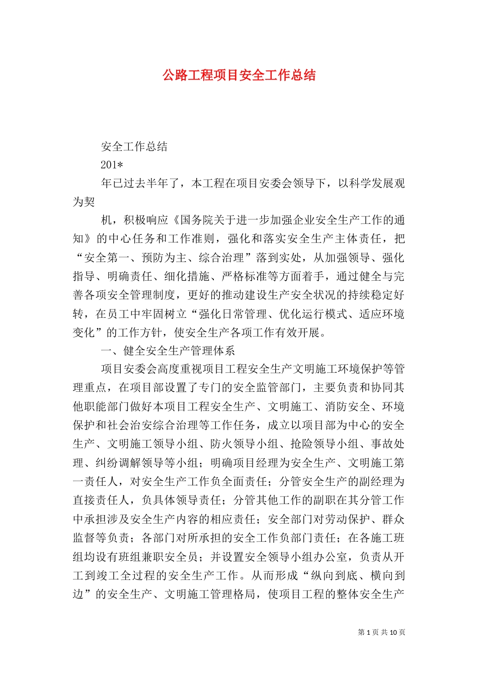 第1页共10页书山有路勤为径,学海无涯苦作舟。公路工程项目安全工作总结安全工作总结201*年已过去半年了,本工程在项目安委会领导下,以科...