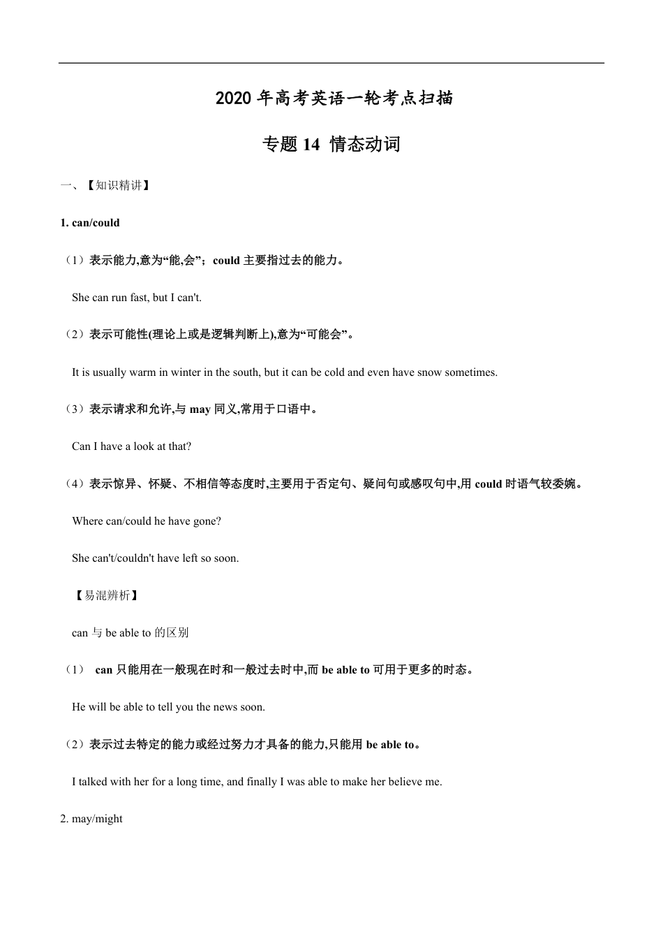 2020年高考英语一轮考点扫描专题14情态动词一、【知识精讲】1.can/could(1)表示能力,意为“能,会”;could主要指过去的能力。Shecanrunfa...