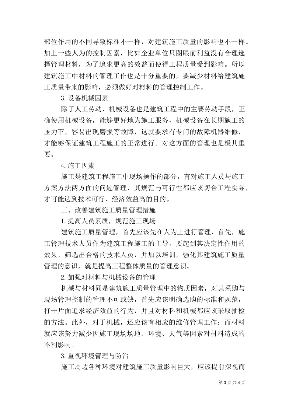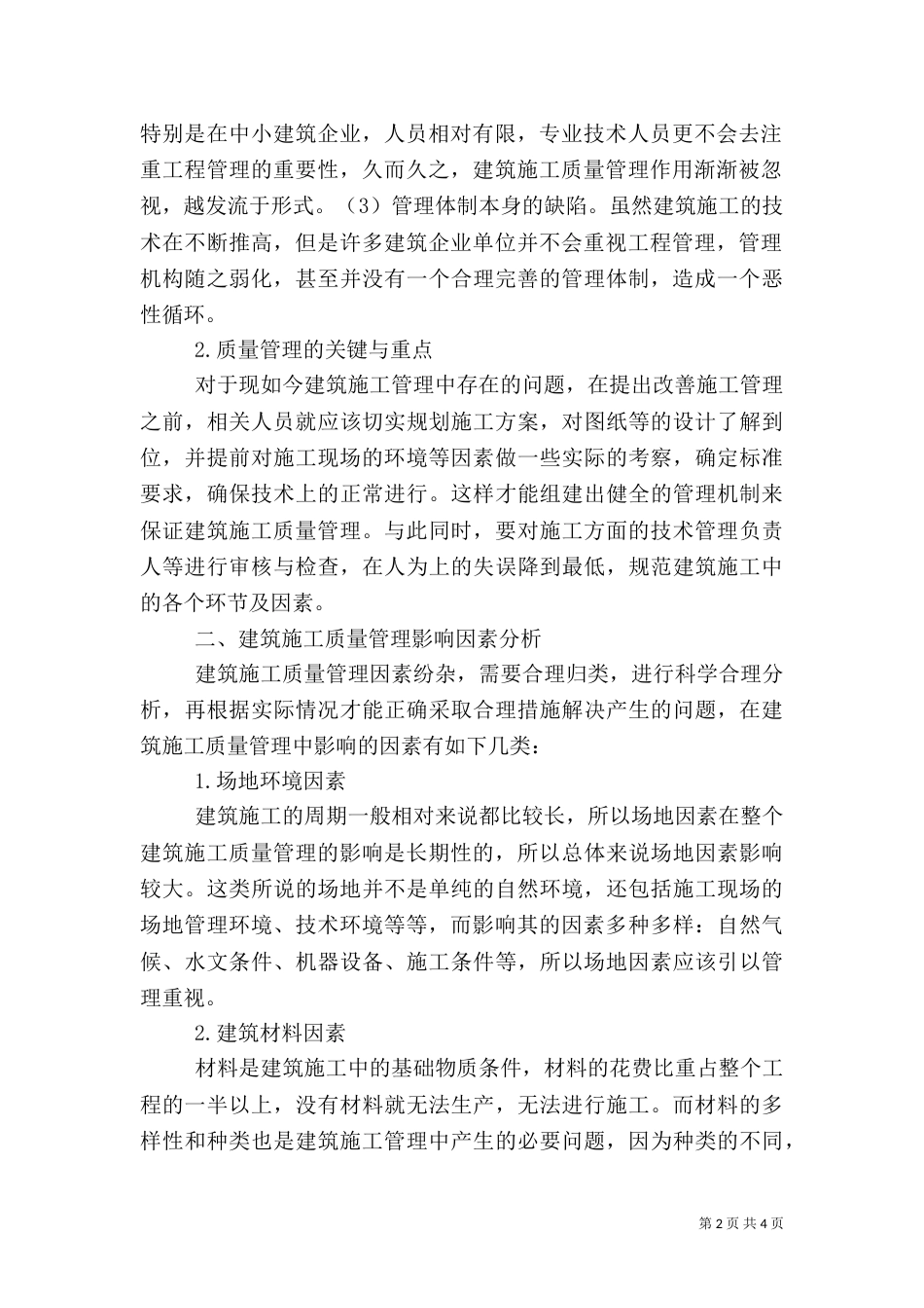 第1页共4页书山有路勤为径,学海无涯苦作舟。建筑施工质量管理重点及影响因素摘要。在这个日异月新的高速发展时代,人们生活水平不断提高,...