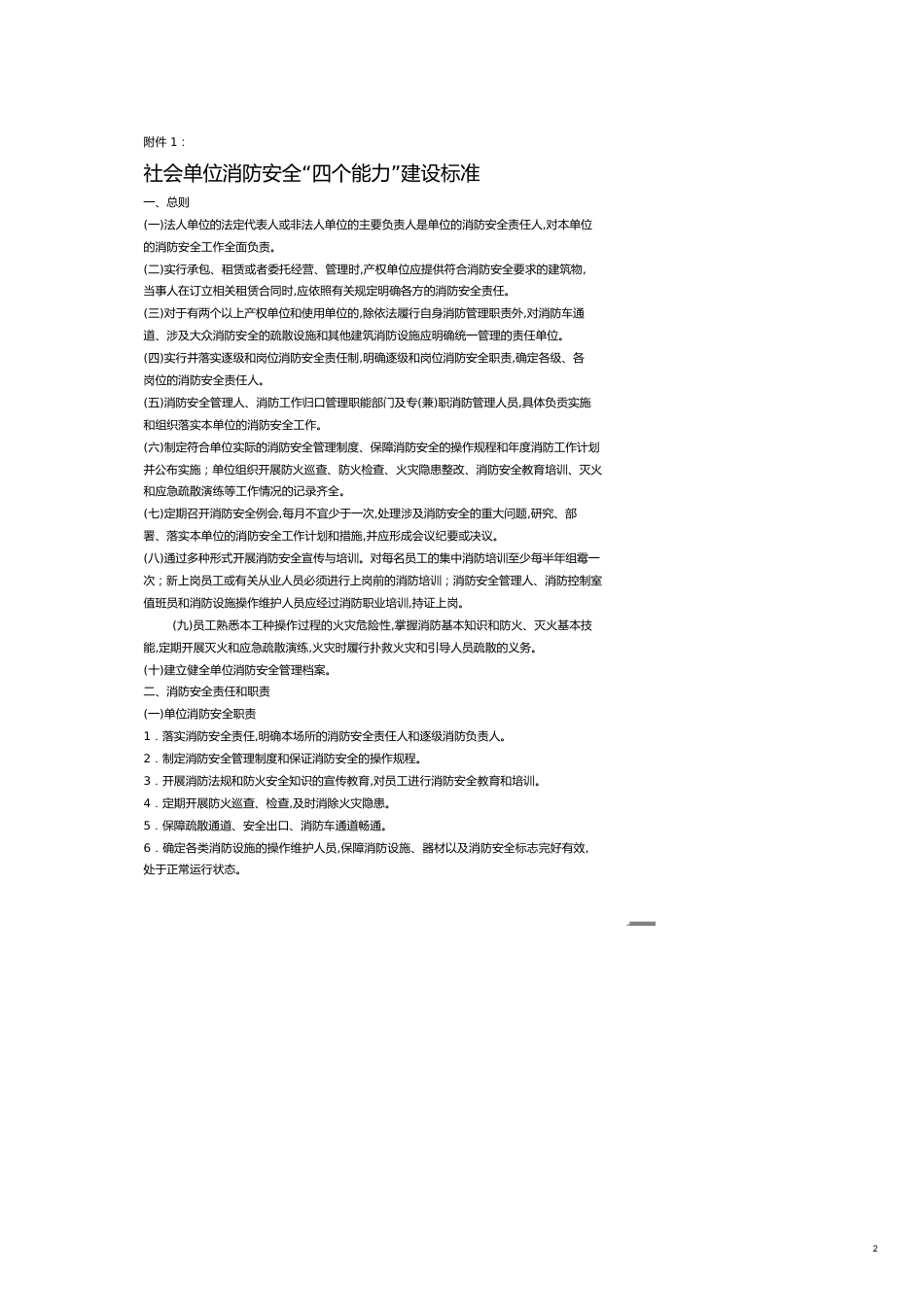 附件1:“”社会单位消防安全四个能力建设标准一、总则(一)法人单位的法定代表人或非法人单位的主要负责人是单位的消防安全责任人,对本单位...