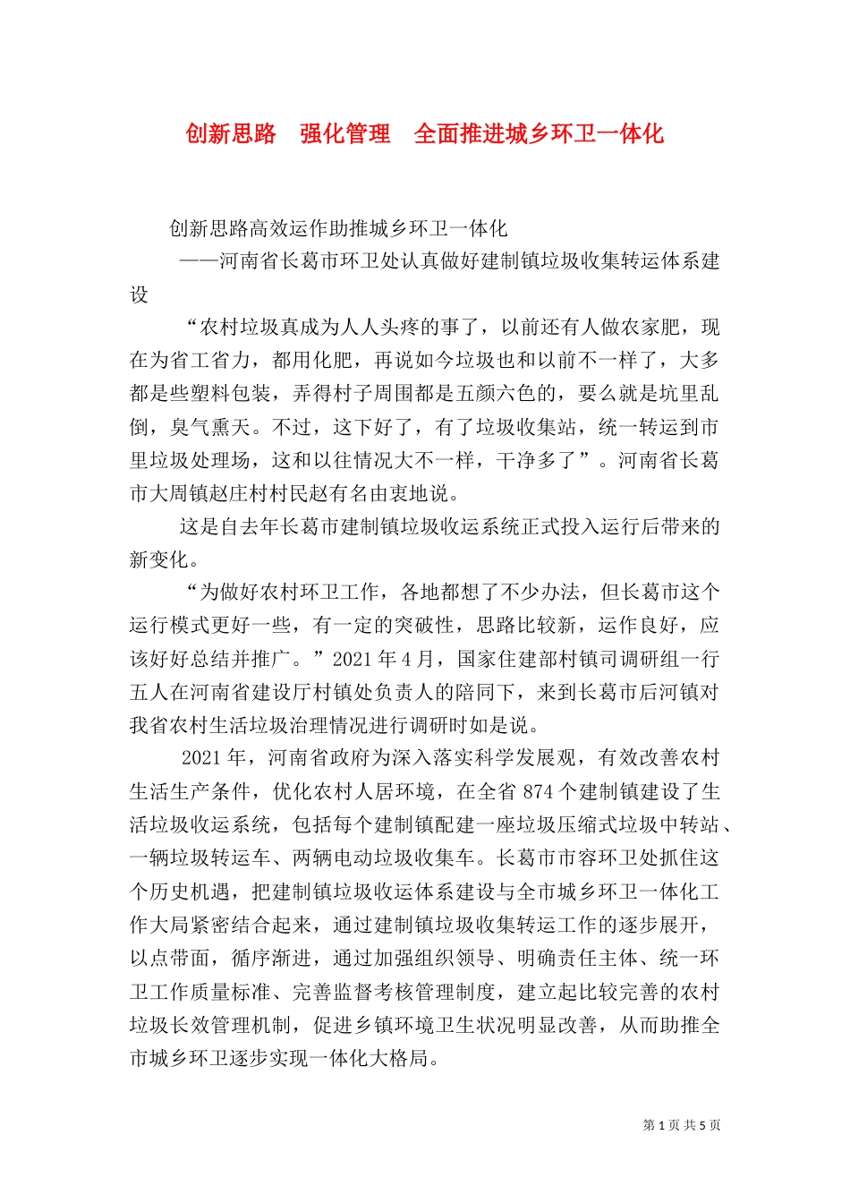 第1页共5页书山有路勤为径,学海无涯苦作舟。创新思路强化管理全面推进城乡环卫一体化创新思路高效运作助推城乡环卫一体化——河南省长葛市...