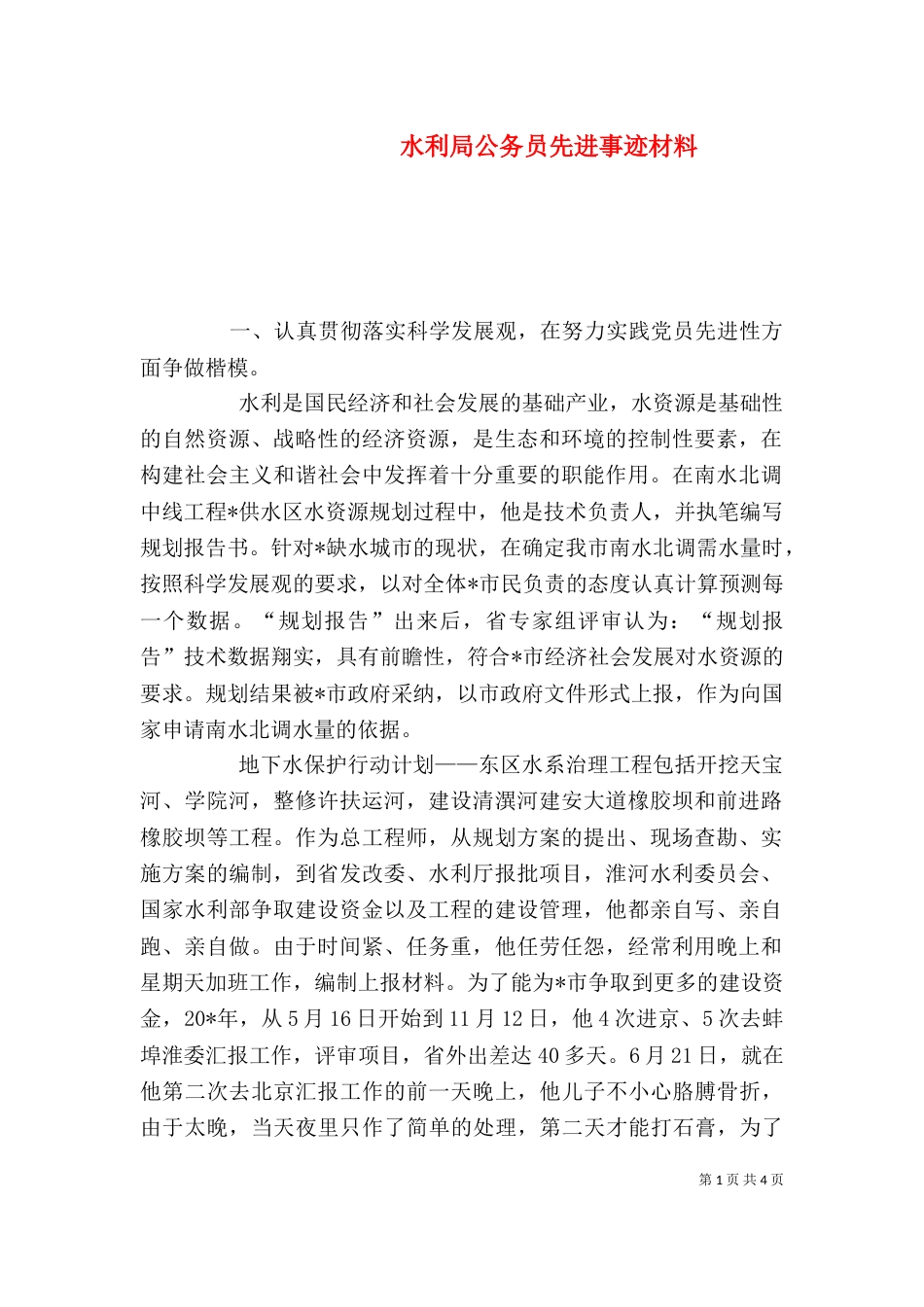 第1页共4页水利局公务员先进事迹材料一、认真贯彻落实科学发展观,在努力实践党员先进性方面争做楷模。水利是国民经济和社会发展的基础产业...