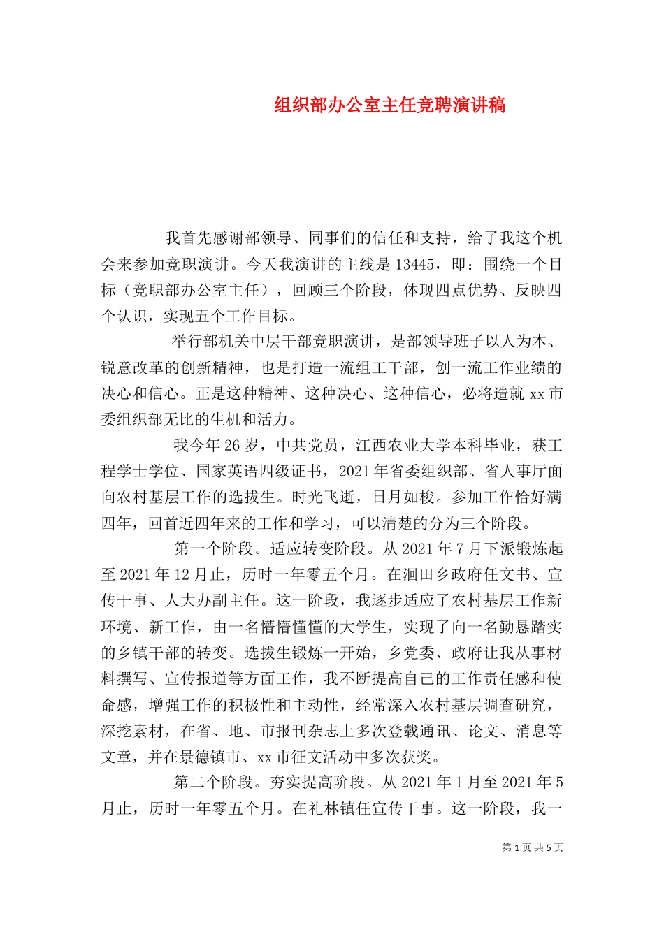 第1页共5页组织部办公室主任竞聘演讲稿我首先感谢部领导、同事们的信任和支持,给了我这个机会来参加竞职演讲。今天我演讲的主线是13445,...