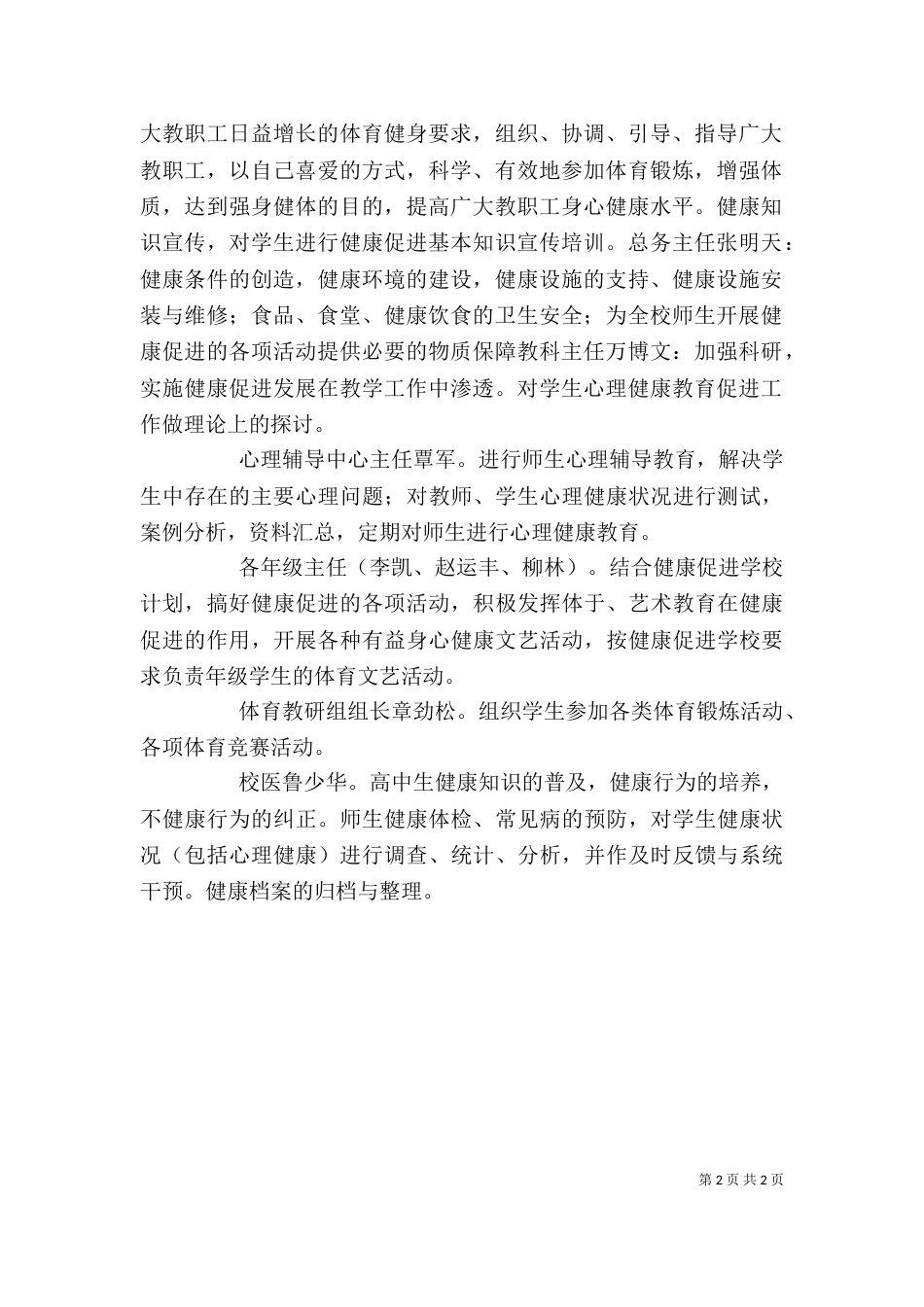 第1页共2页学校健康促进领导小组东湖高中健康促进学校工作领导小组成员及分工副组长:李鹏鹏副校长刘飞副校长刘昌桂副校长工会主席付高赤党...