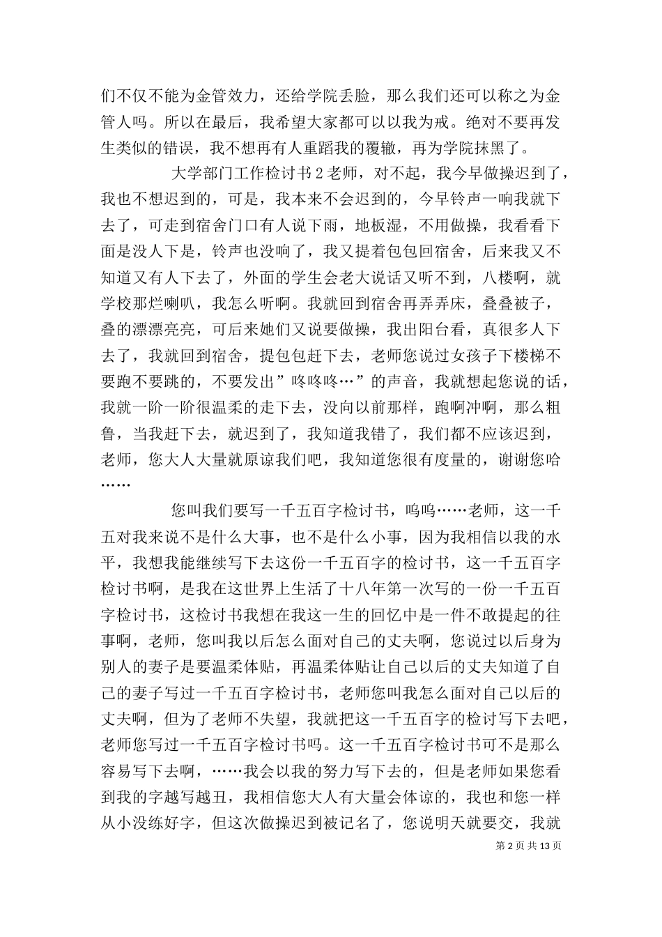 第1页共13页大学部门工作检讨书在晚上检查寝室时,由于缺少工作经验,所以很多地方都被我忽略了。要不然像被子摆放不规律这种明显的错误也...