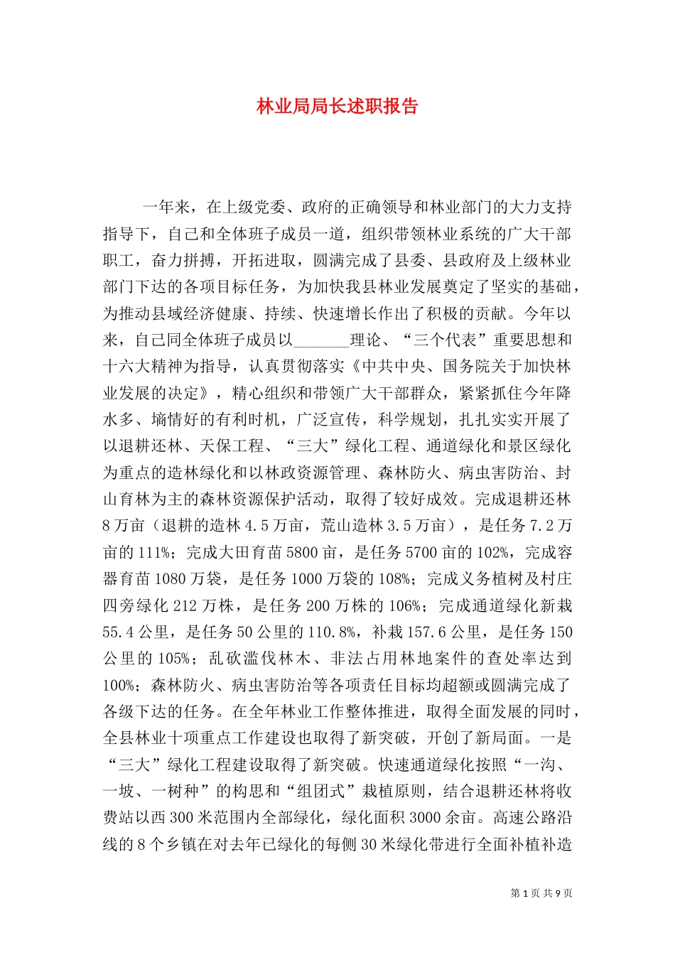第1页共9页书山有路勤为径,学海无涯苦作舟。林业局局长述职报告一年来,在上级党委、政府的正确领导和林业部门的大力支持指导下,自己和全...