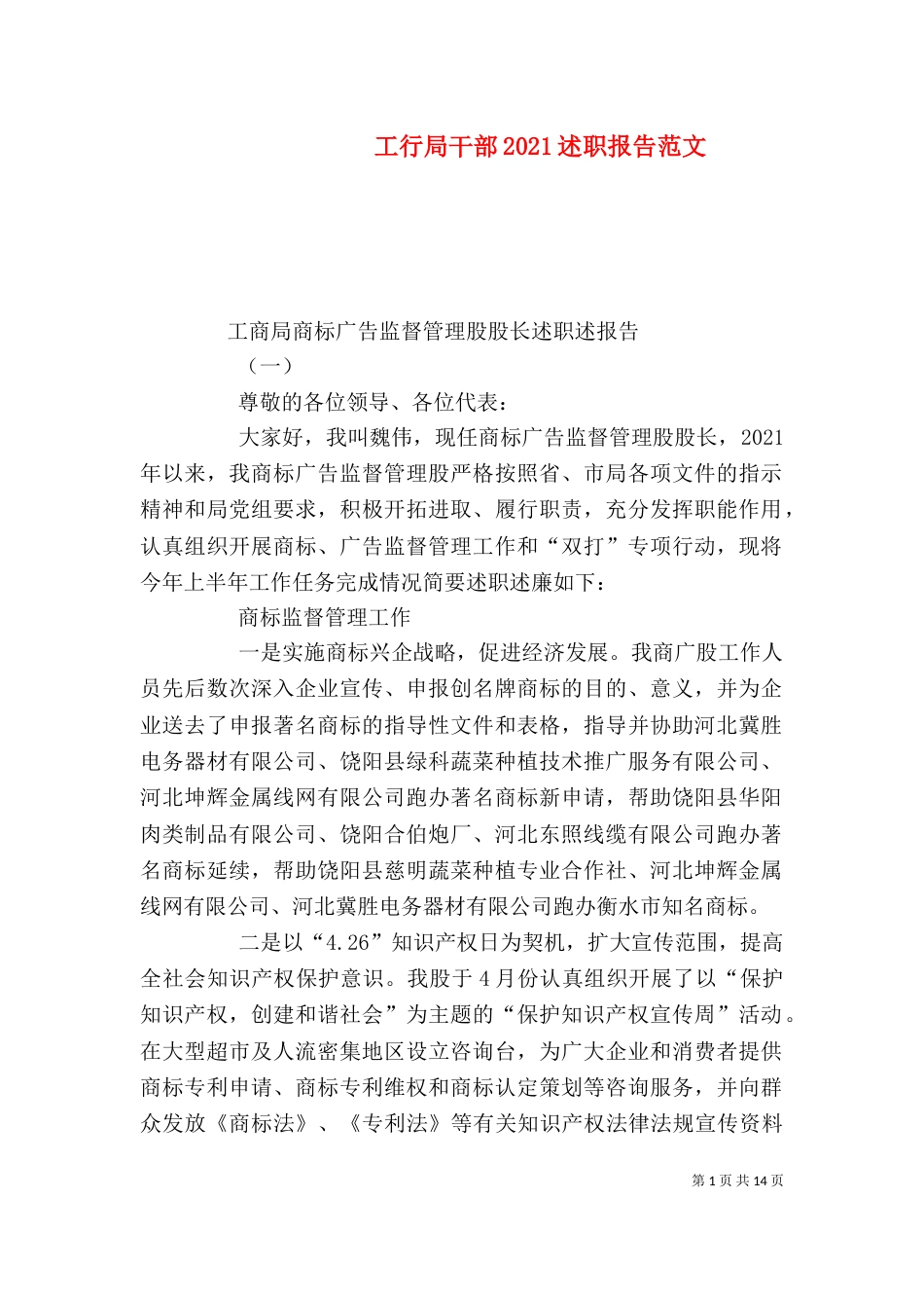 第1页共14页工行局干部2021述职报告范文工商局商标广告监督管理股股长述职述报告(一)尊敬的各位领导、各位代表:大家好,我叫魏伟,现任...
