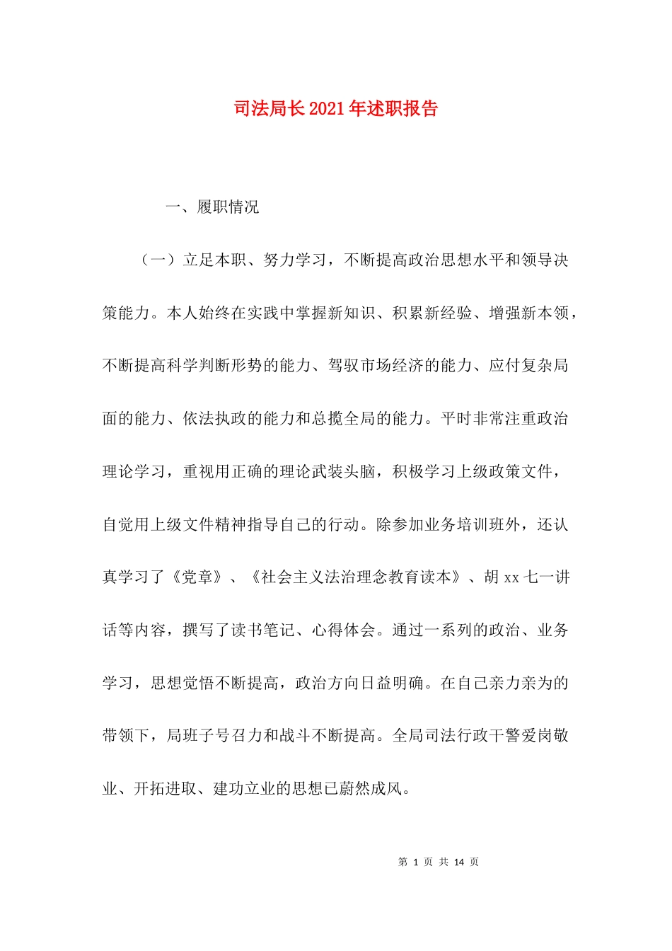 第1页共14页司法局长2021年述职报告一、履职情况(一)立足本职、努力学习,不断提高政治思想水平和领导决策能力。本人始终在实践中掌握新...