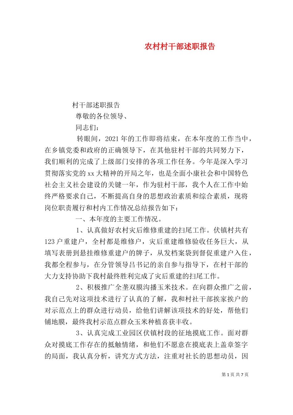 第1页共7页农村村干部述职报告村干部述职报告尊敬的各位领导、同志们:转眼间,2021年的工作即将结束,在本年度的工作当中,在乡镇党委和政...